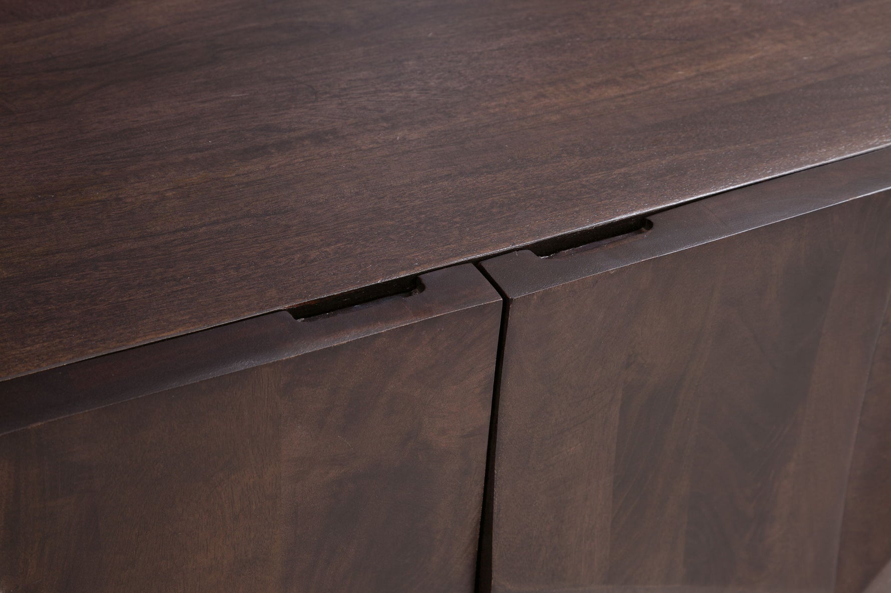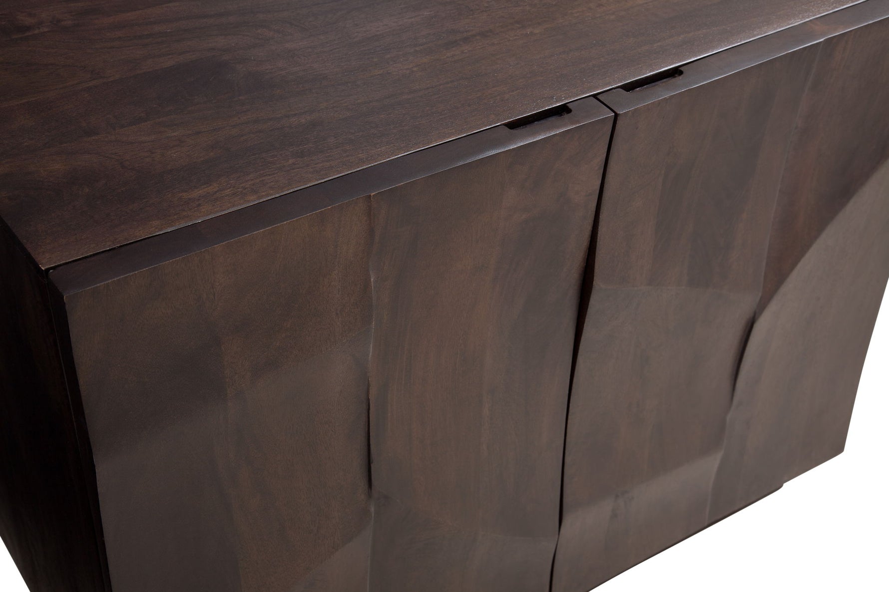 The Reverie Accent Cabinet epitomizes contemporary elegance with a touch of modern flair. Crafted from solid mango wood with a rich coffee bean finish, it exudes warmth and character. The two doors feature soft, organic-inspired carving details, adding a subtle yet distinctive charm to the piece. Inside, you'll find a single fixed shelf offering ample storage space for your belongings. As mango wood is a natural material, each cabinet boasts unique variations in color, density, grain, and finishing, making it truly one-of-a-kind. Embrace modernity and organic beauty with this stylish and functional cabinet that complements any living space with its timeless appeal.