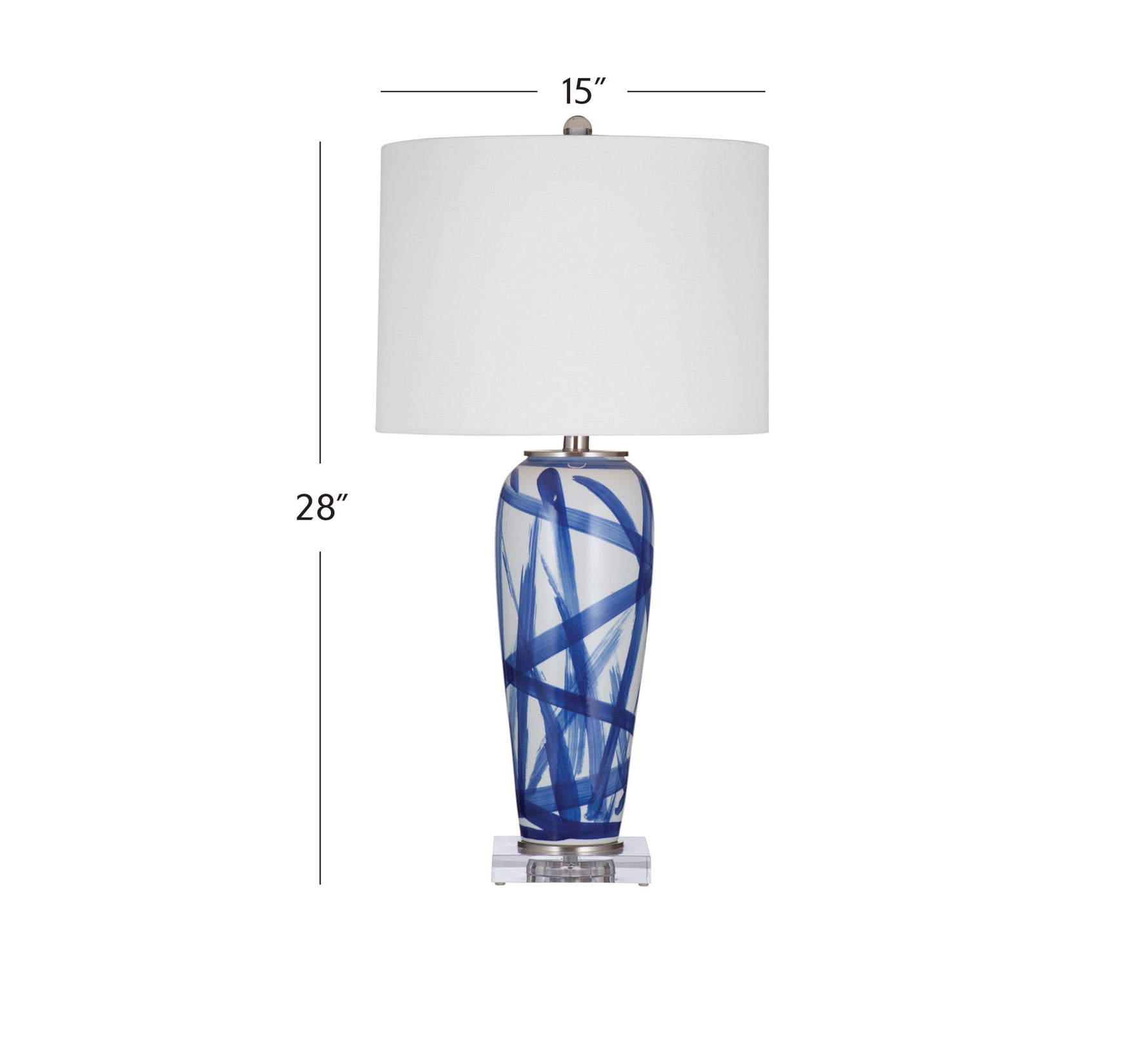 • This blue and white table lamp features a Modern style.