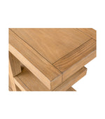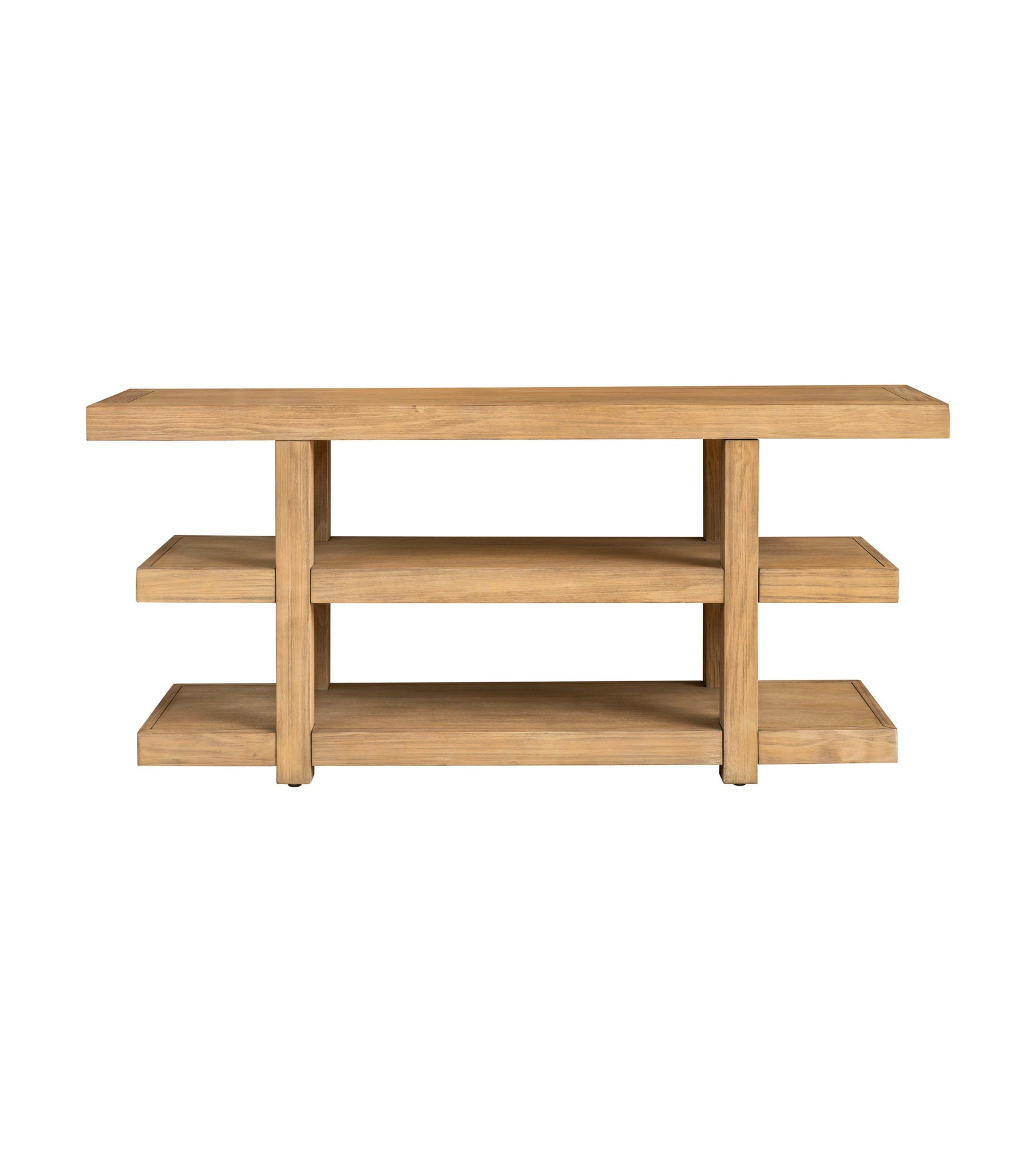 The Riggs Console Table blends rustic character with modern minimalism, offering a clean and functional design that suits a variety of spaces. Crafted from solid wood and wire-brushed oak veneers in a warm wheat oak finish, it features a streamlined silhouette and two open shelves for versatile storage and display.