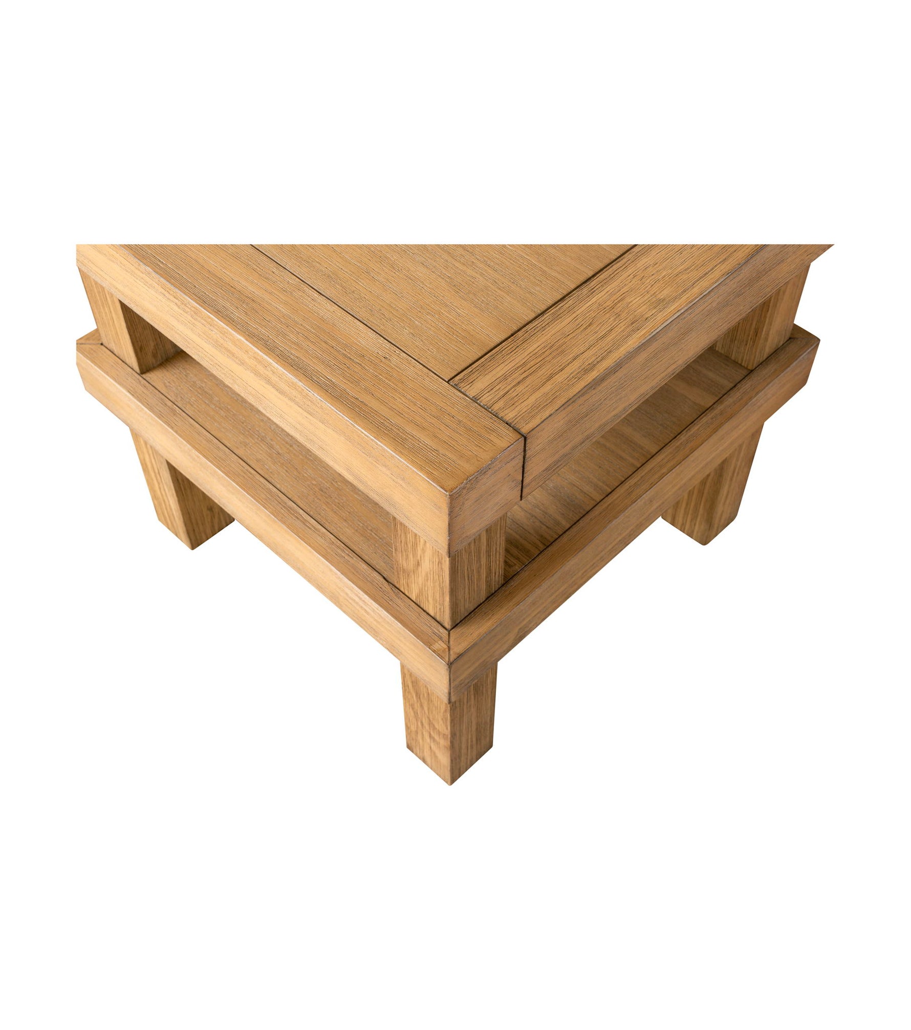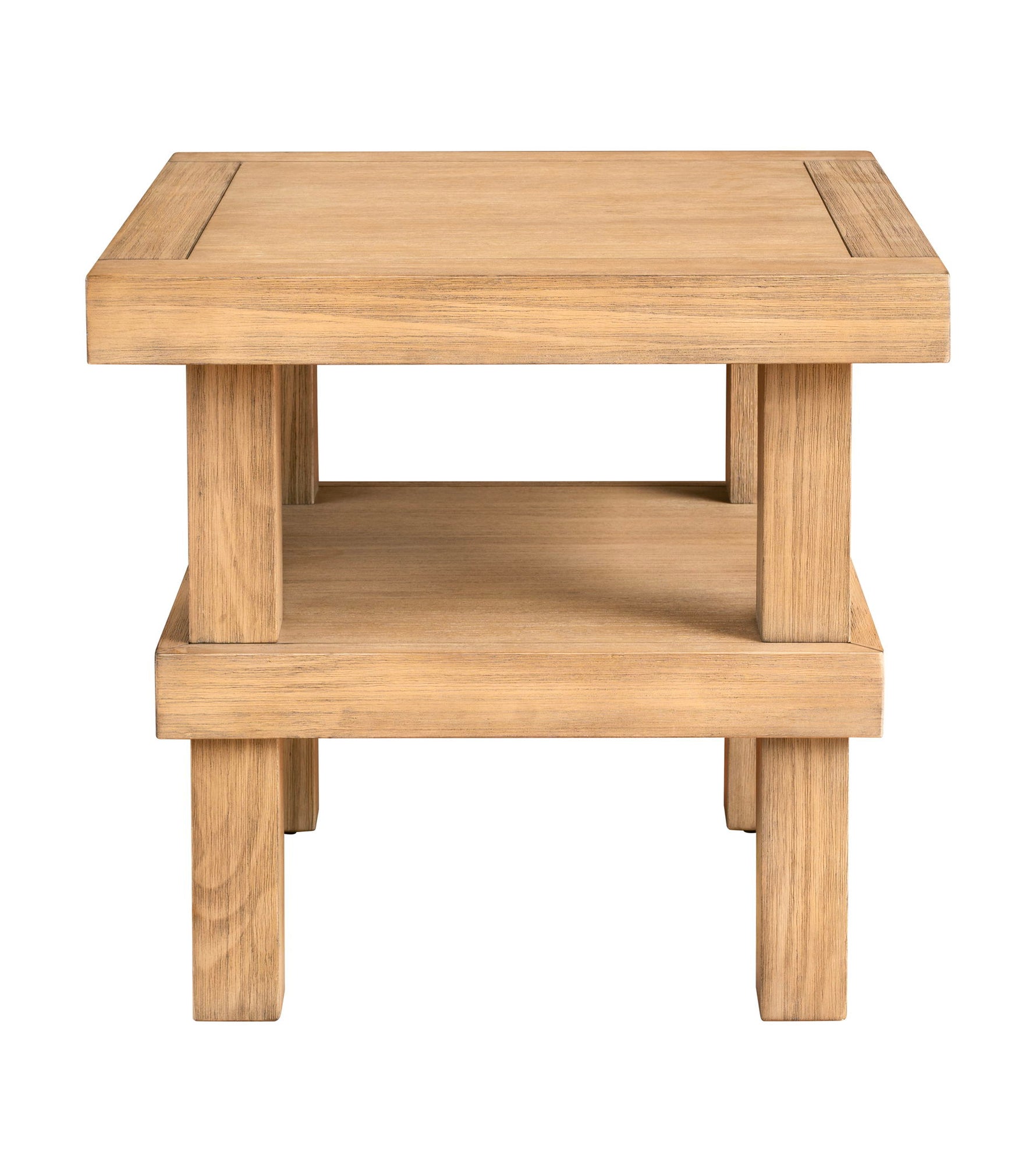 The Riggs End Table brings a touch of rustic modern charm to any room with its clean lines and natural textures. Crafted from solid wood and wire-brushed oak veneers in a warm wheat oak finish, it offers the perfect balance of simplicity and character. A single drawer with custom antiqued pewter hardware provides convenient storage, while an open lower shelf keeps essentials close at hand. Compact yet full of style, the Riggs End Table is a timeless accent for casual, refined living.