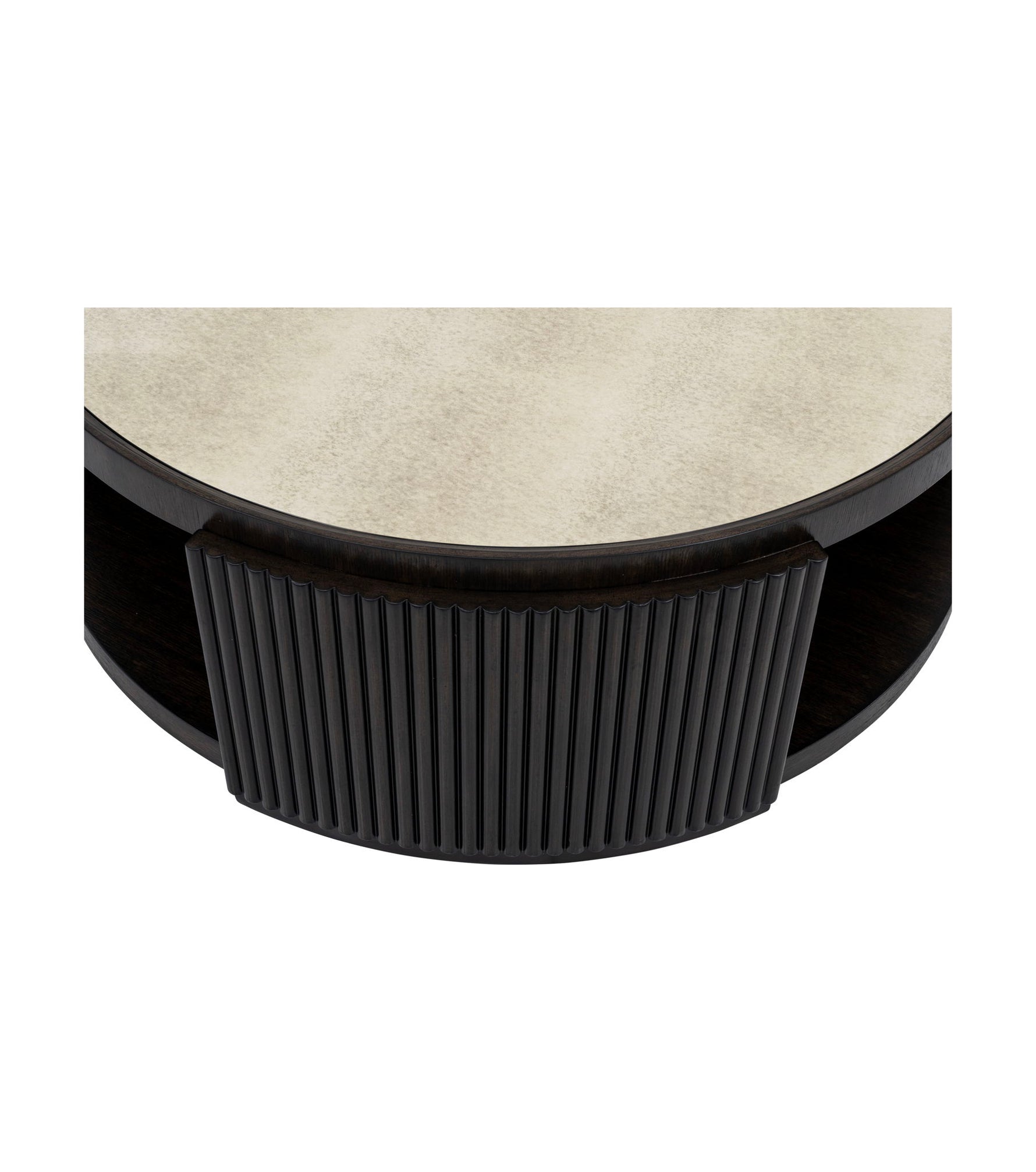 The Rivera Coffee Table showcases a contemporary design with elegant hints of glamour. Its round, open-frame structure features reeded detailing in a chic charcoal oak finish, perfectly complemented by gold-tinted antique mirror insets on the top. The design not only enhances visual interest but also adds a sophisticated touch to any space. Equipped with casters, this coffee table offers effortless mobility, making it a practical yet stylish addition to your living area. With its modern aesthetic and luxurious accents, the Rivera Coffee Table is sure to elevate your home decor.