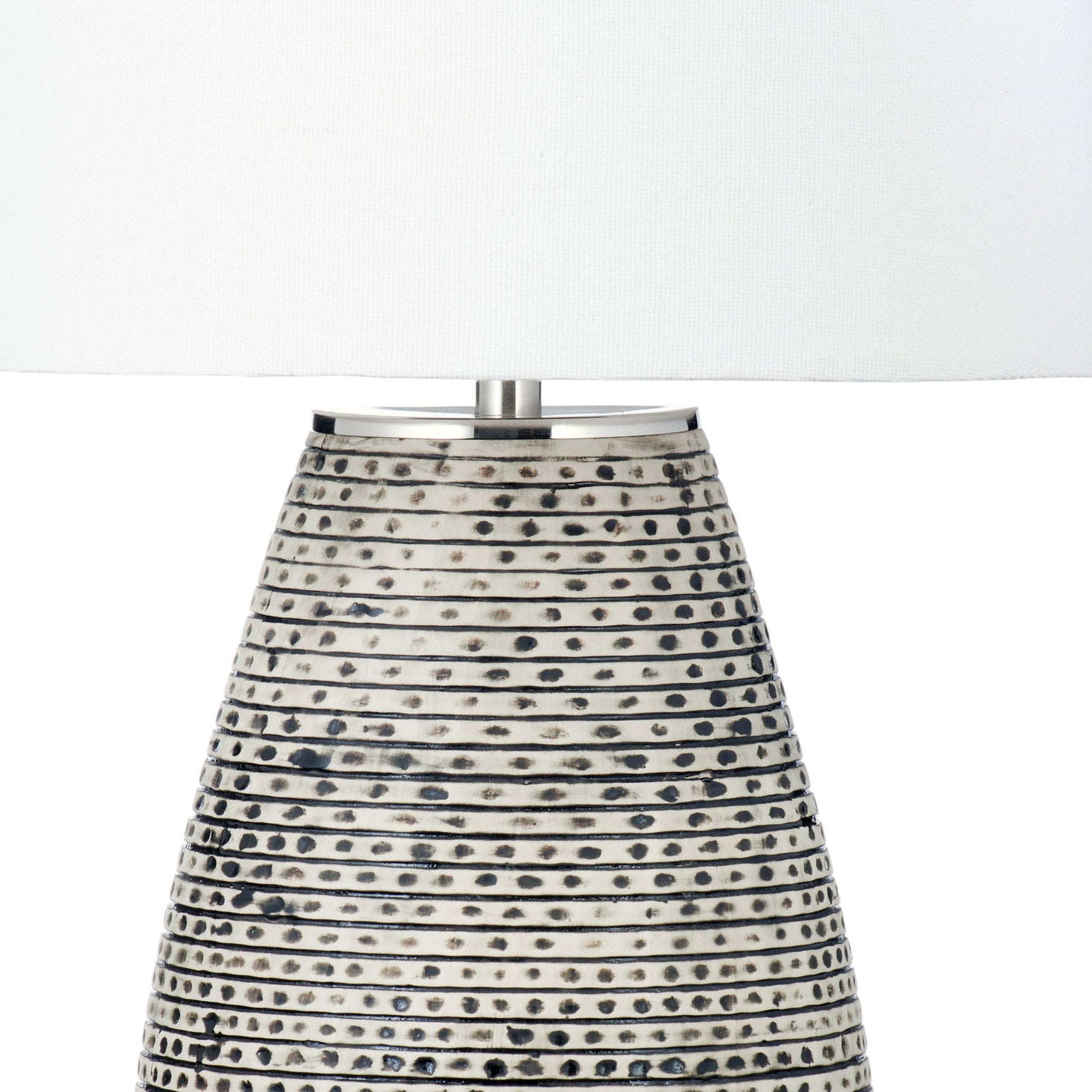 • Features a white, tapered drum shaped lamp shade