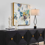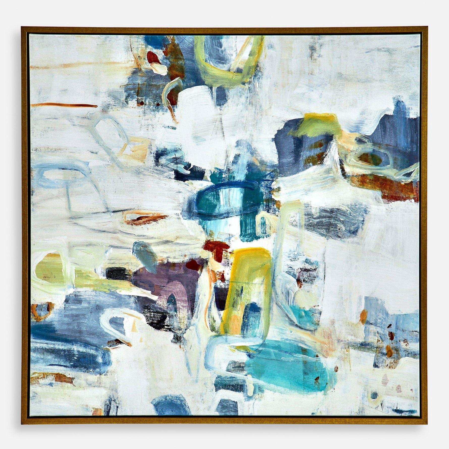 Giclee On Canvas, This Abstract Piece Features Shades Of Blue, Tan And Yellow Highlighted With White Accents. A Solid Wood Gallery Frame With Gold Finish Completes The Artwork. May Be Hung Horizontal Or Vertical. Each Canvas Is Proudly Handcrafted And Printed In The USA. Artwork By Lisa Ridgers.