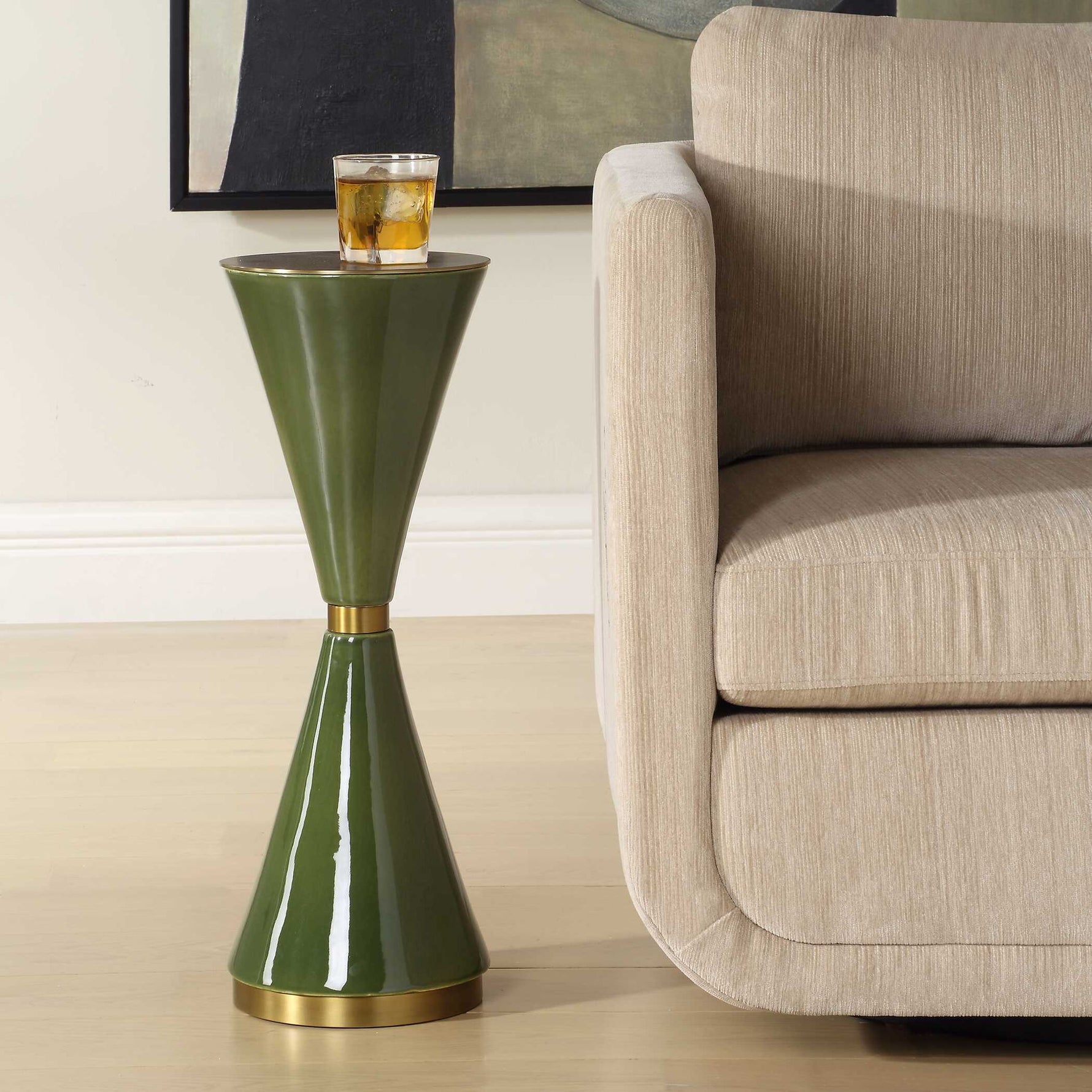 This Striking Ceramic Drink Table Showcases A Captivating Hourglass Silhouette In A Rich Jade Green Glaze, Accented By Brass Plated Iron Details.