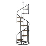 A unique black bookcase in a spiral design is sure to make your heart sing. Eight open shelves cascade down the frame of this rustic and industrial piece. The frame is crafted from metal with a black finish. The triangular shelves are finished in a warm wood color for contrast. Instantly enhance living areas and offices with this black rustic bookcase.