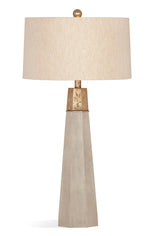The Rowan Table Lamp features a cement base topped with a gold accent and a linen shade. Its modern shape paired with the natural cement finish make this lamp a dynamic addition to any living space.