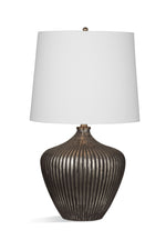The Sanbro Table Lamp features a ribbed motif with a white drum shade.
