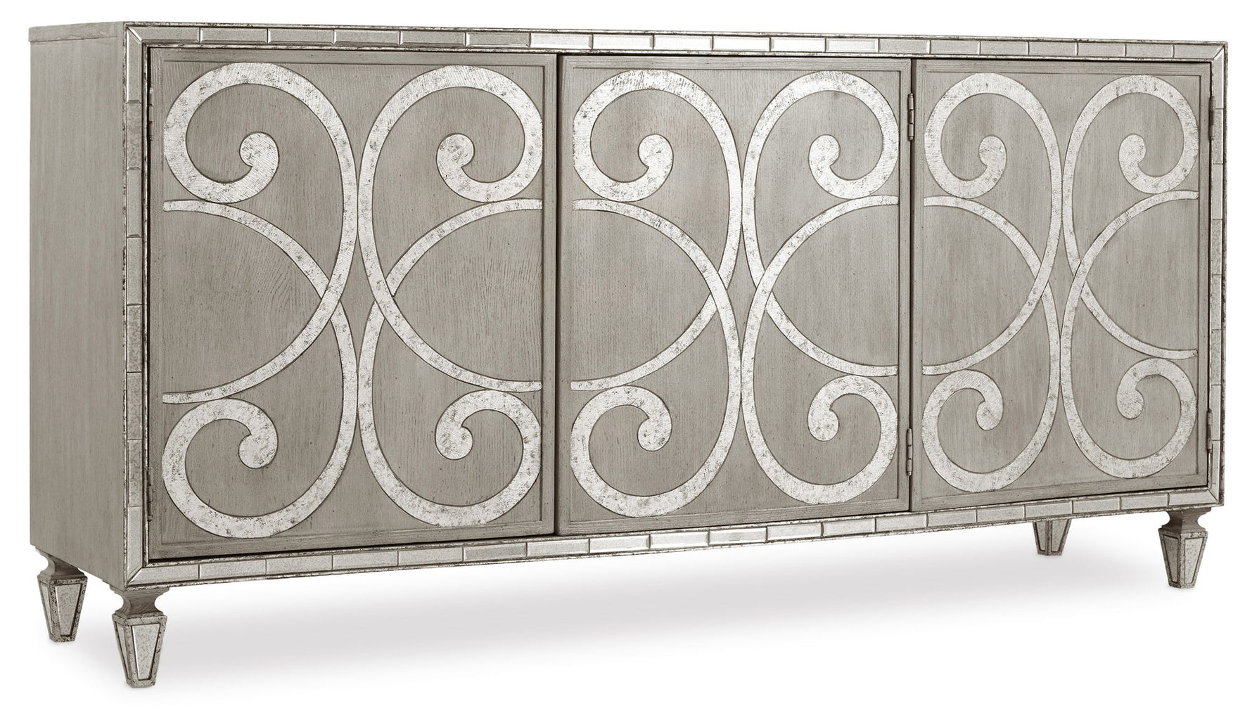 Unit price perCreate a luxe atmosphere with this glamorous buffet with dual-function capability as an entertainment center to accommodate up to a 75-inch TV. Crafted of Poplar and Hardwood Solids, it is adorned with the Epoque finish, a greige with shimmer on Oak veneers. Three doors with touch latches have one adjustable shelf behind each door. Pursue serenity at home. Create your own personal sanctuary, a special place where you can experience comfort within.