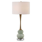 - The Sanctuary Table Lamp Features A Curvy, Greenish-gray Glass Body Paired With A Fluted Style Neck That's Finished In A Plated Antique Brass, Displayed On An Elegant Crystal Foot.