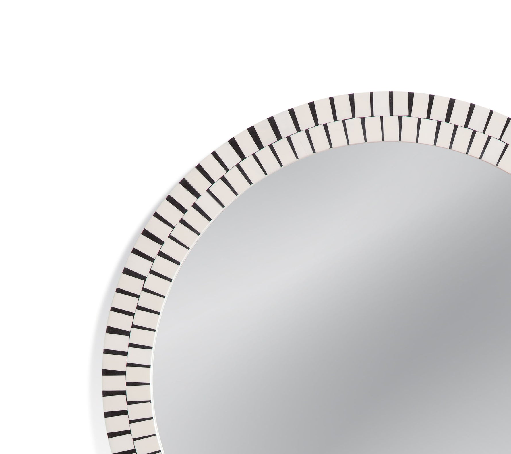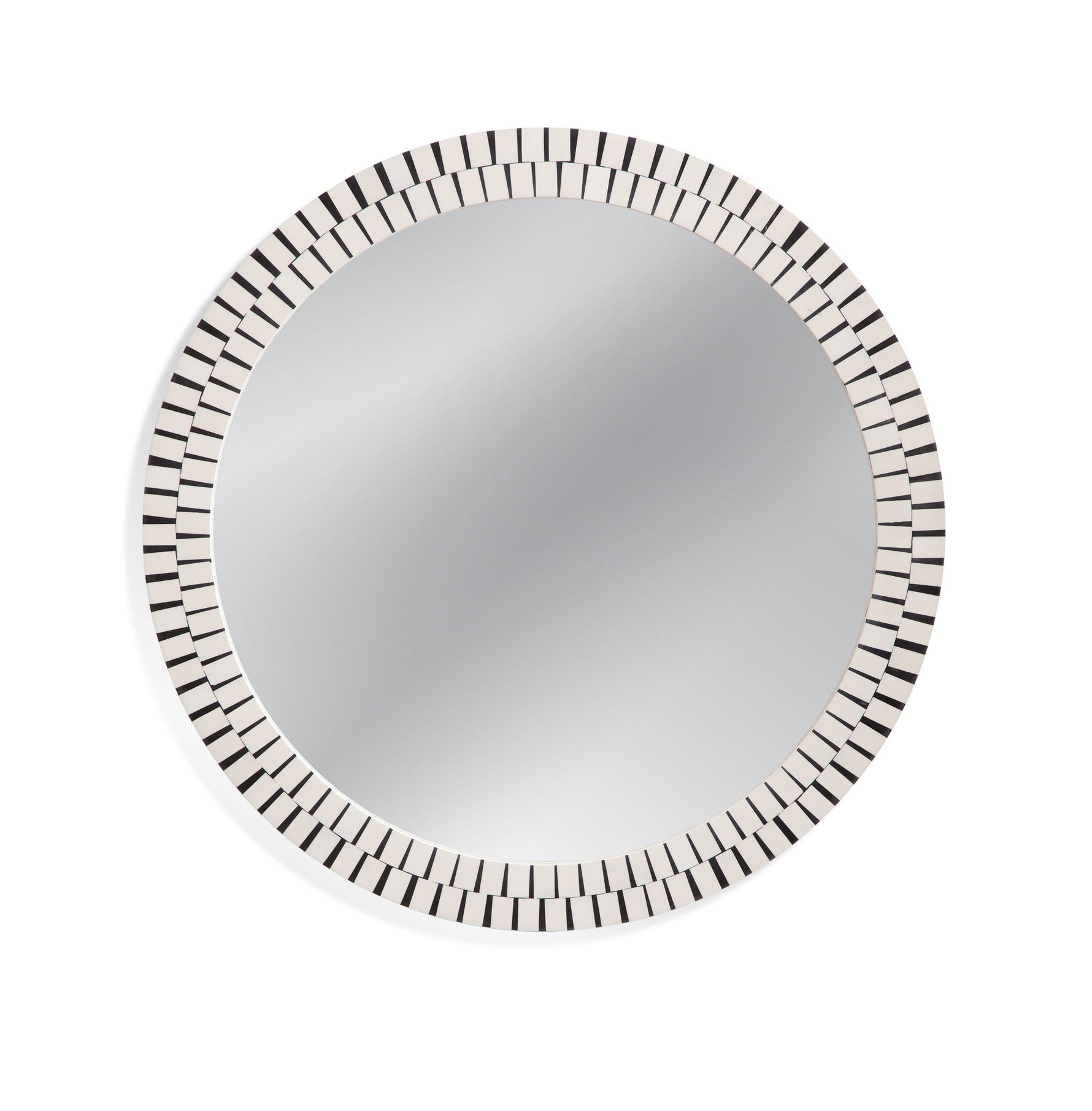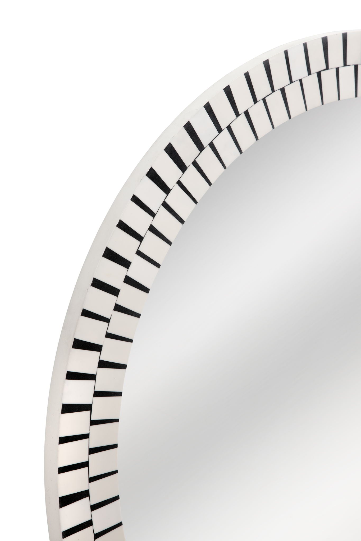 Sanna Wall Mirror is round framed in a black and white bone frame. Includes two "D" ring attachment points for ease of access for hanging.