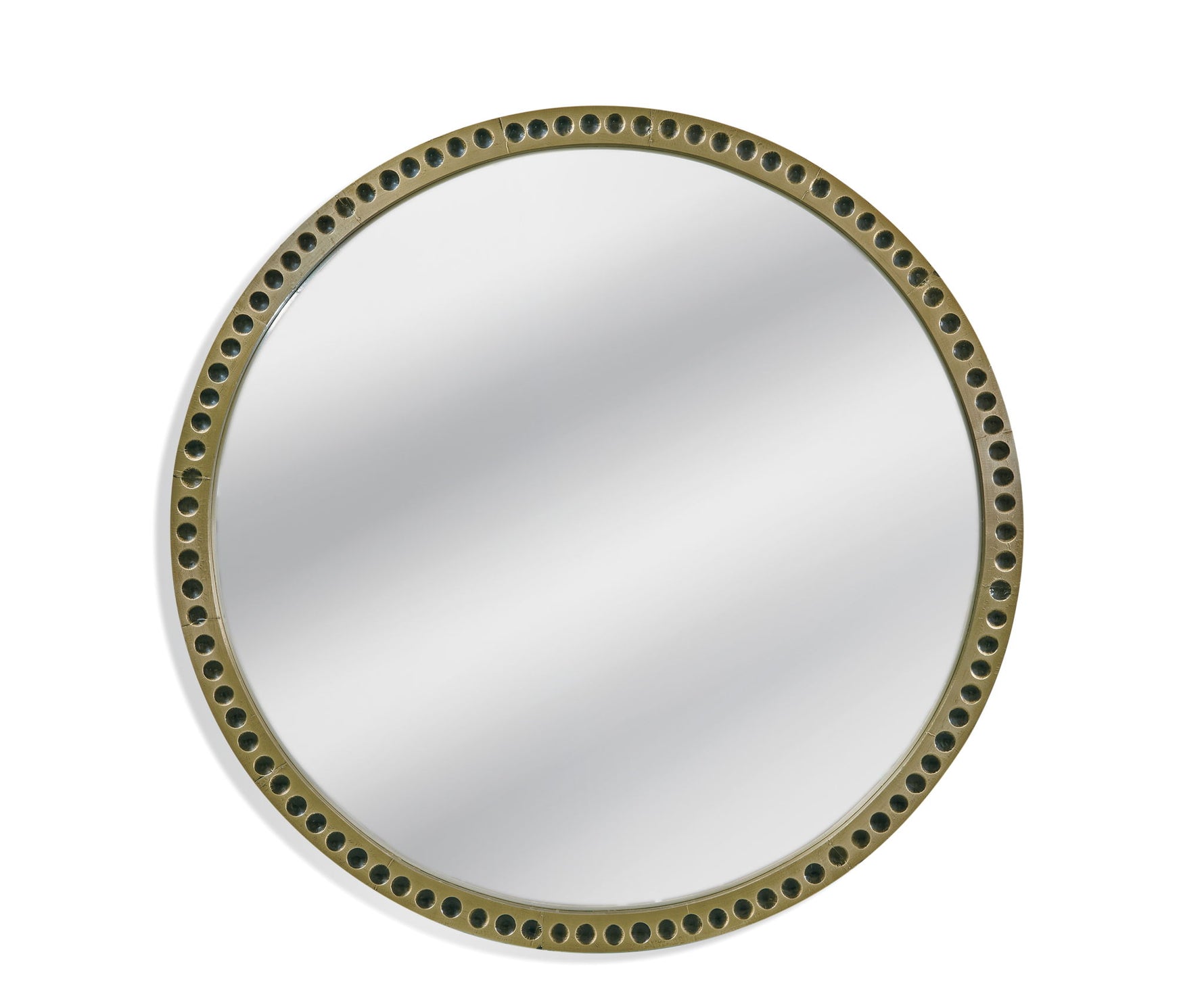 Sansee Wall Mirror is round featuring a circle motif design. The mirror frame features a brass clad finish. Includes two "D" ring attachment points for ease of access for hanging.