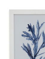 Seaweed Under Water I features blue image of seaweed on a white background in a simple white frame.