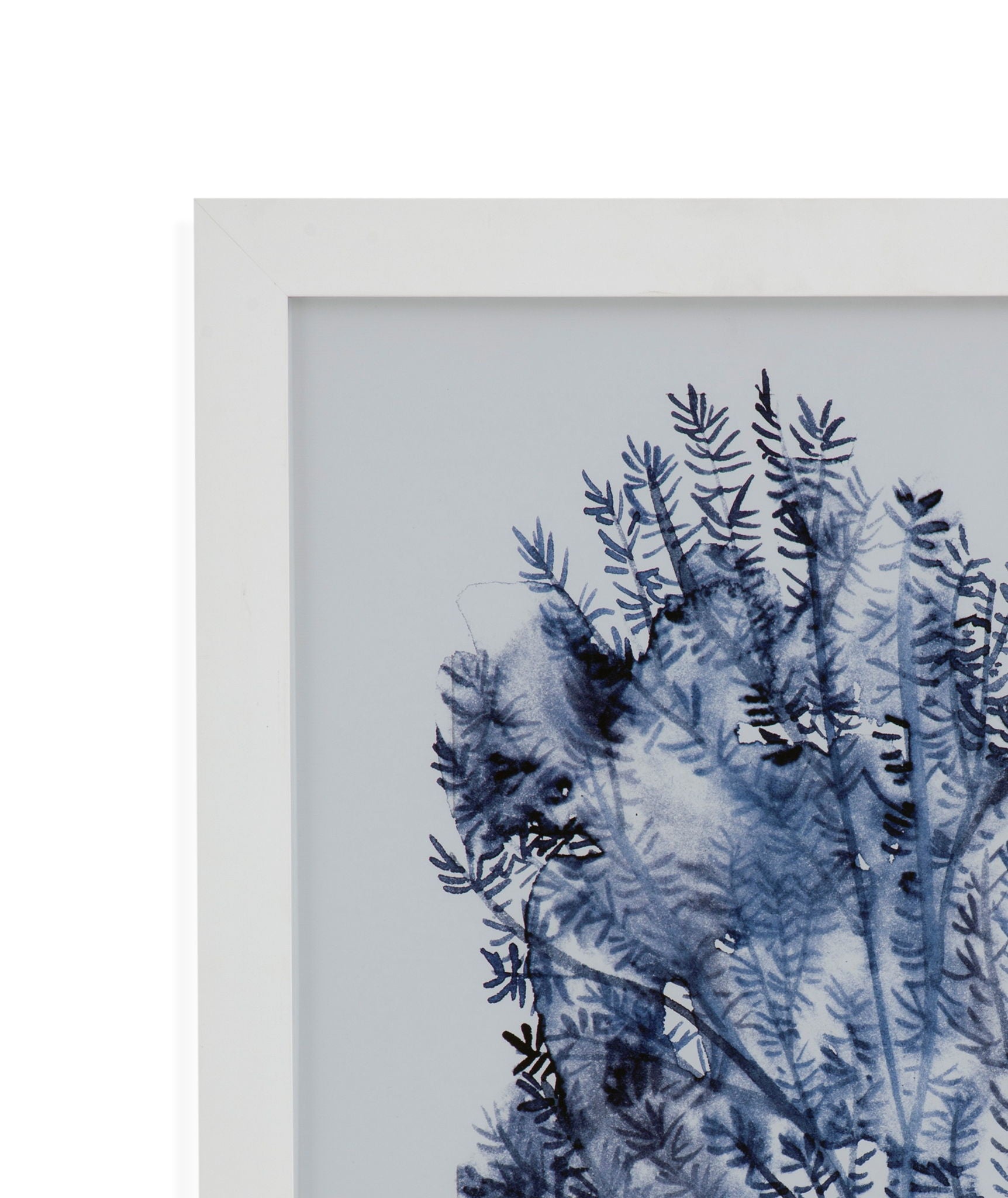 Seaweed Under Water II features blue image of seaweed on a white background in a simple white frame.