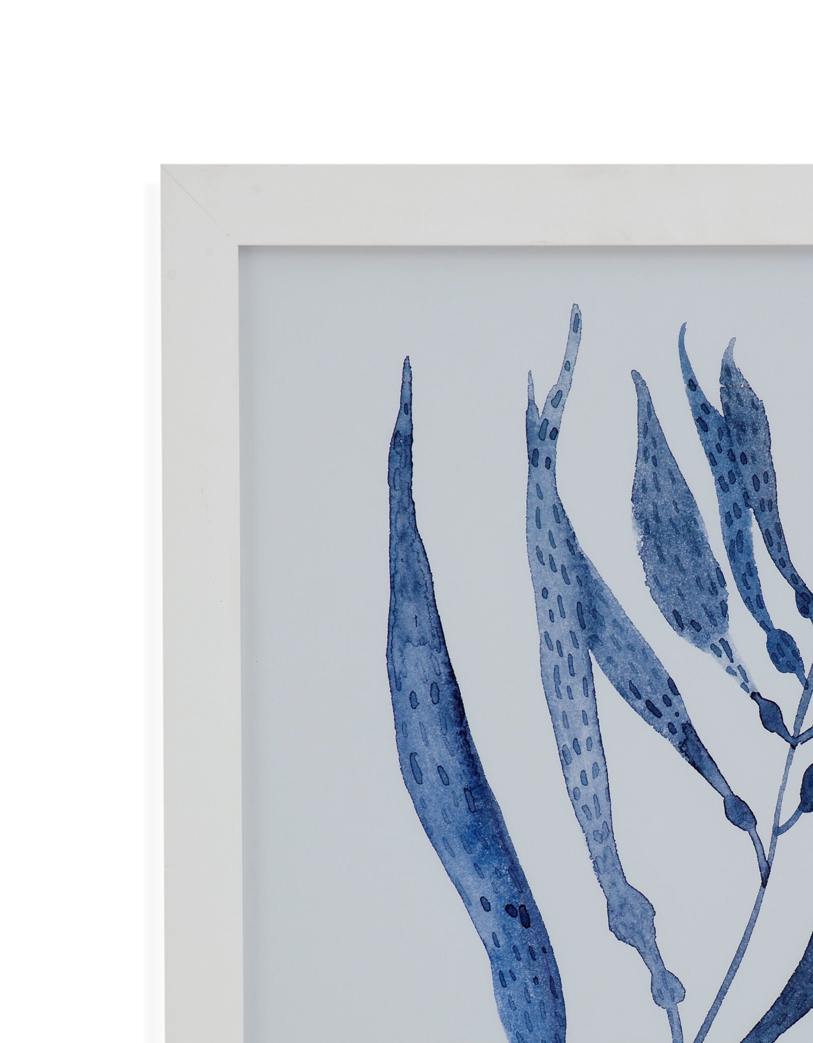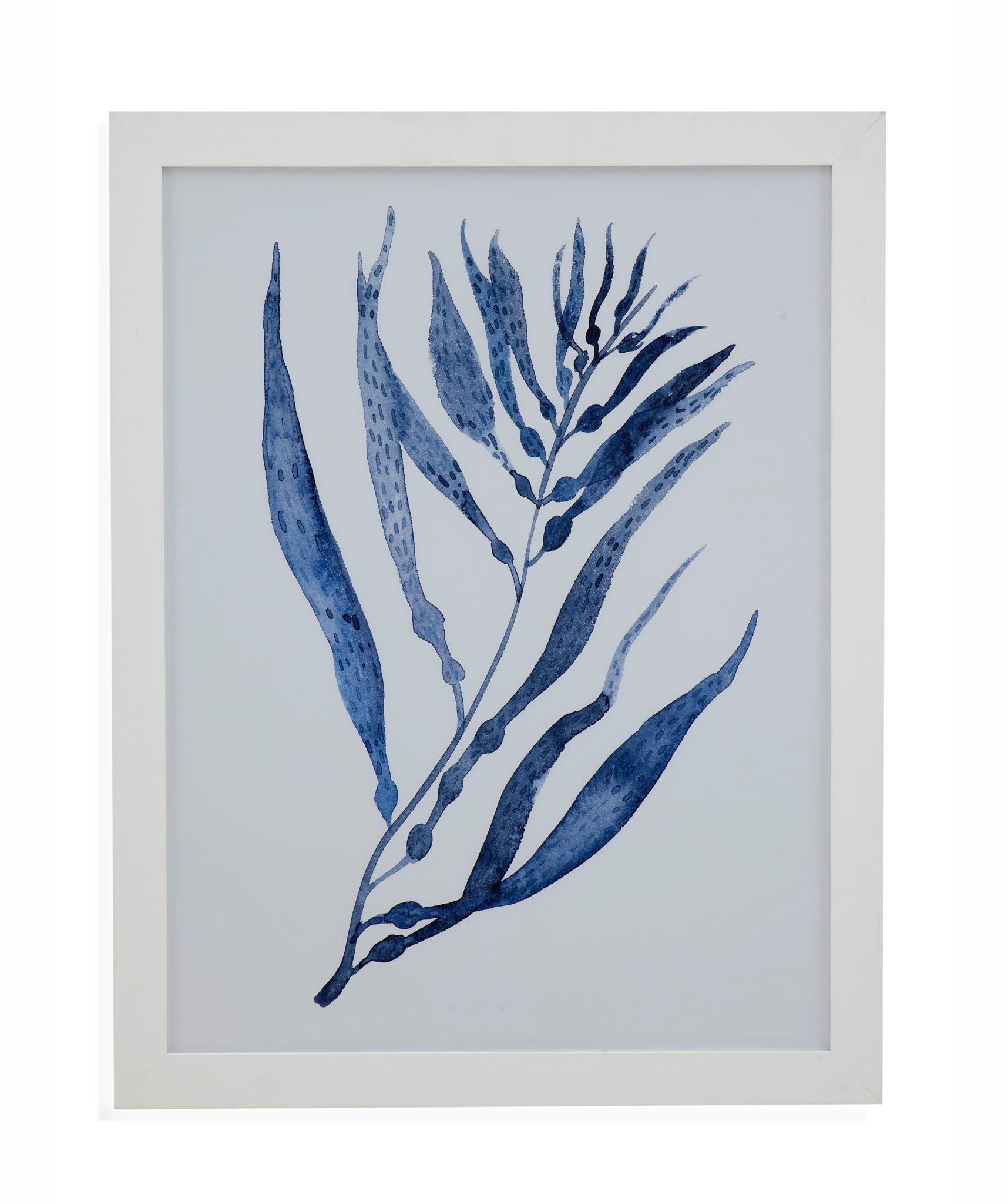 Seaweed Under Water III features blue image of seaweed on a white background in a simple white frame.
