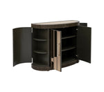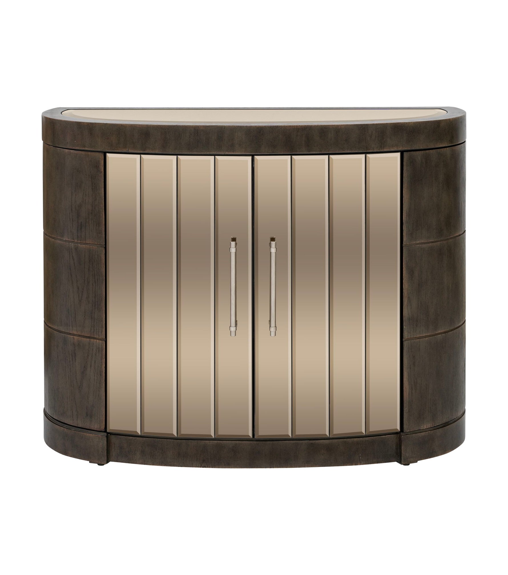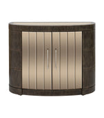 The Serrano Accent Cabinet blends rustic charm with modern elegance in its unique design. Crafted with a demilune-shaped frame of lightly distressed oak veneers in a rich chocolate brown finish, it exudes warmth and sophistication. The bronze-tinted beveled mirrors on the doors and top add a touch of glamour. Inside, four doors open to reveal six adjustable shelves, offering ample storage with a stylish flair.
