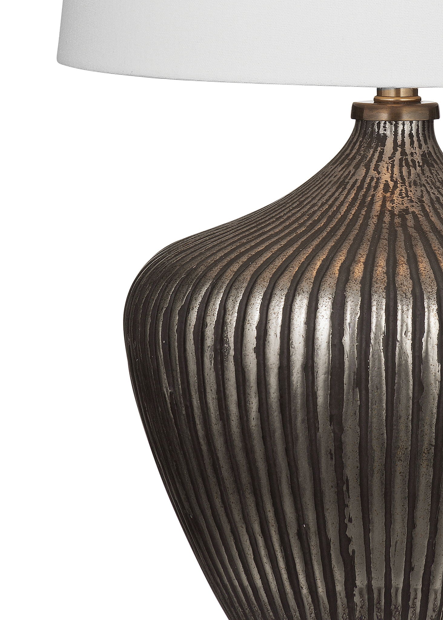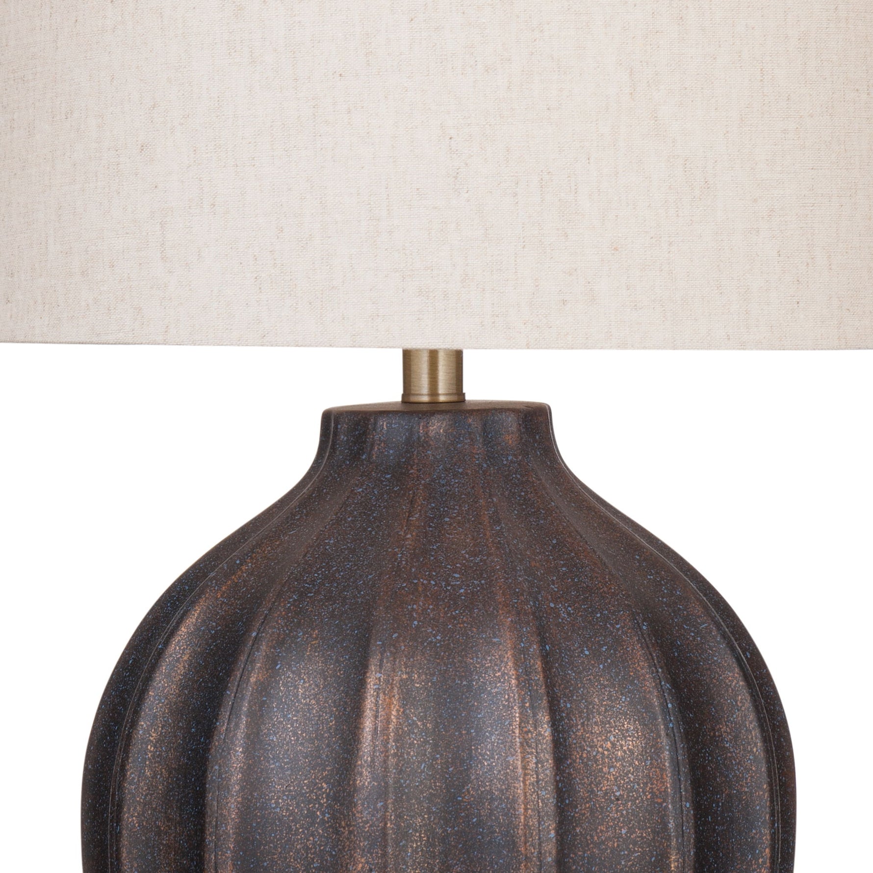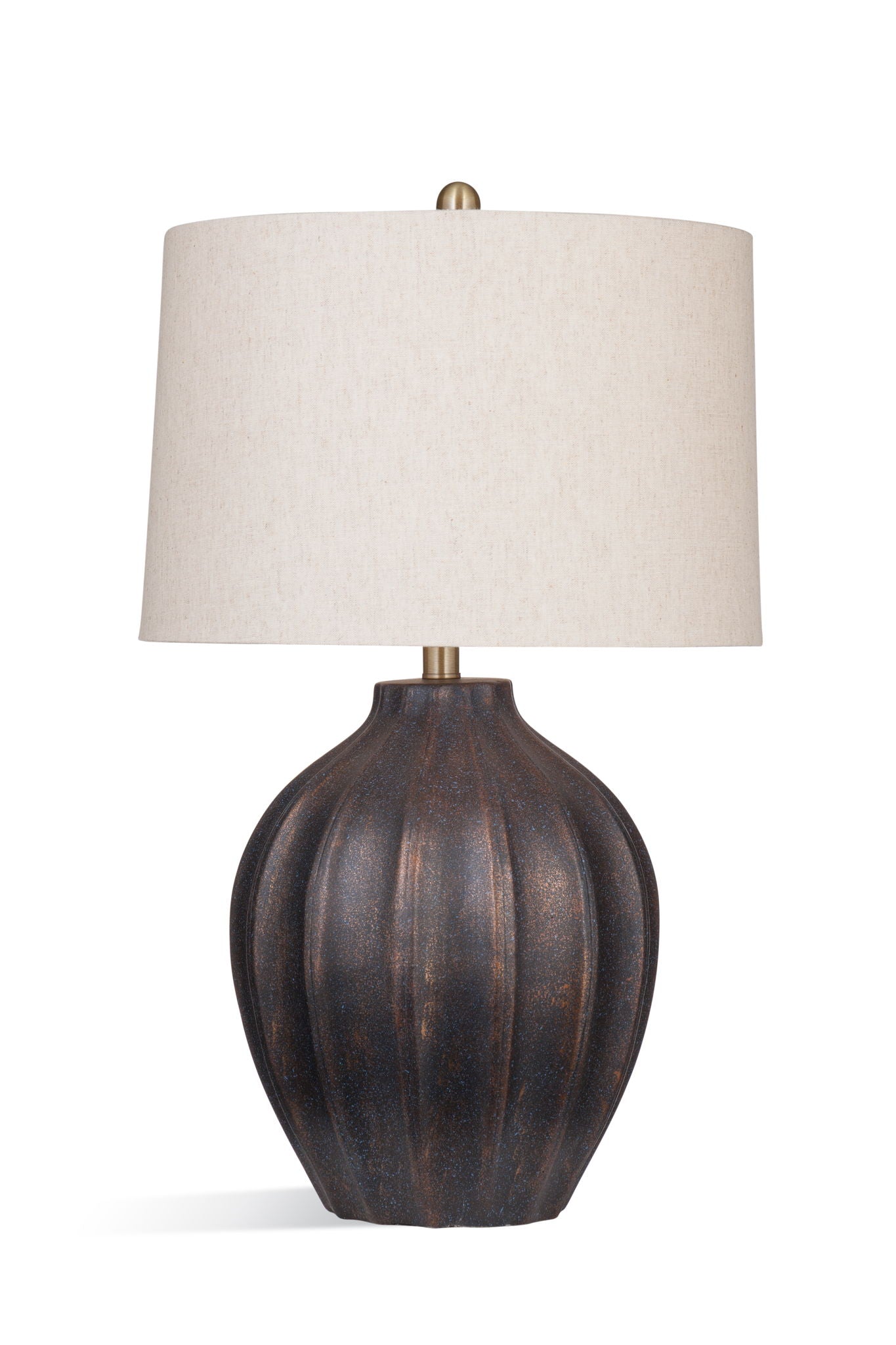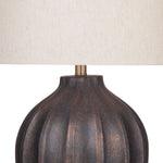 The Sevee Table Lamp is crafted of resin with a drum shade. Finished in a dark cement with gold accents.