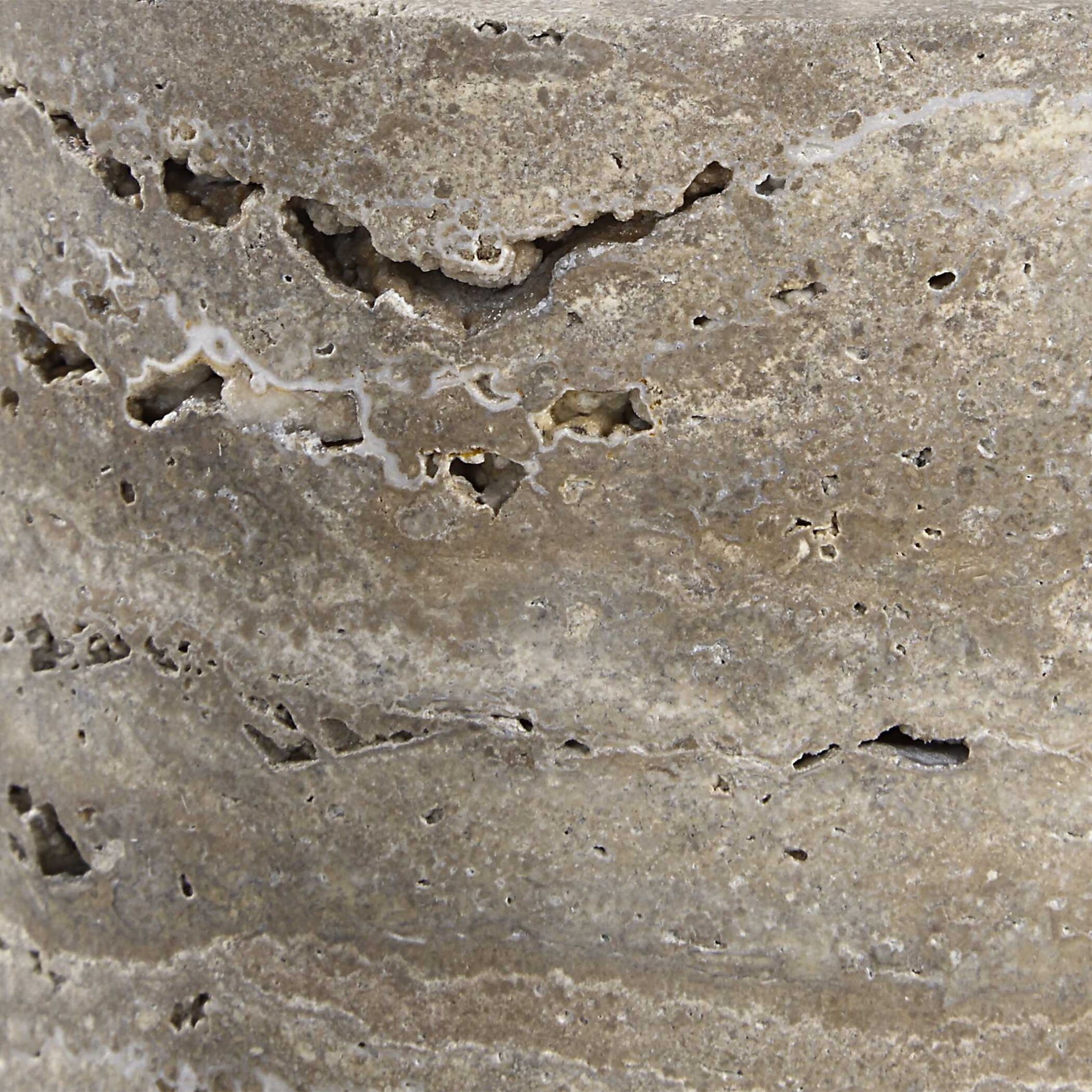 - Illuminate Your Space With Sophistication Using These Cylinders Of Unfilled Gray Travertine Featuring Dark Bronze Metal Candle Cups. Crafted For Elegance And Durability, These Candleholders Add A Touch Of Refined Ambiance To Any Room. Since It Is A Natural Stone, Each Piece Of Travertine Is Unique. Two 4"x3" White Candles Included. Sizes: S-4x13x4, L-4x16x4