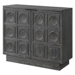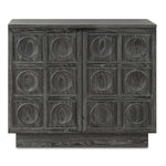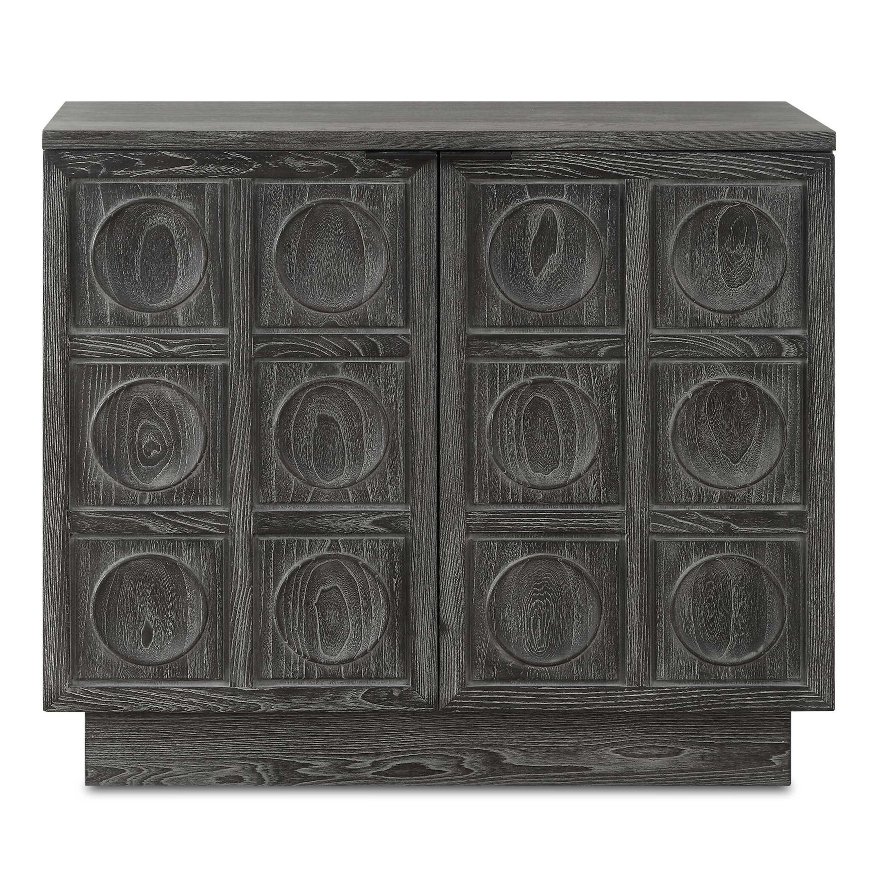 A Two Door Cabinet Featuring A Striking Carved Circular Design, Constructed From Solid Elm And Elm Veneer. The Rich Ebony Stain Highlights The Dramatic Wood Grain. Two Complementing Solid Iron Door Pulls Make For Stylish And Effortless Functionality. Has One Interior Adjustable Shelf.