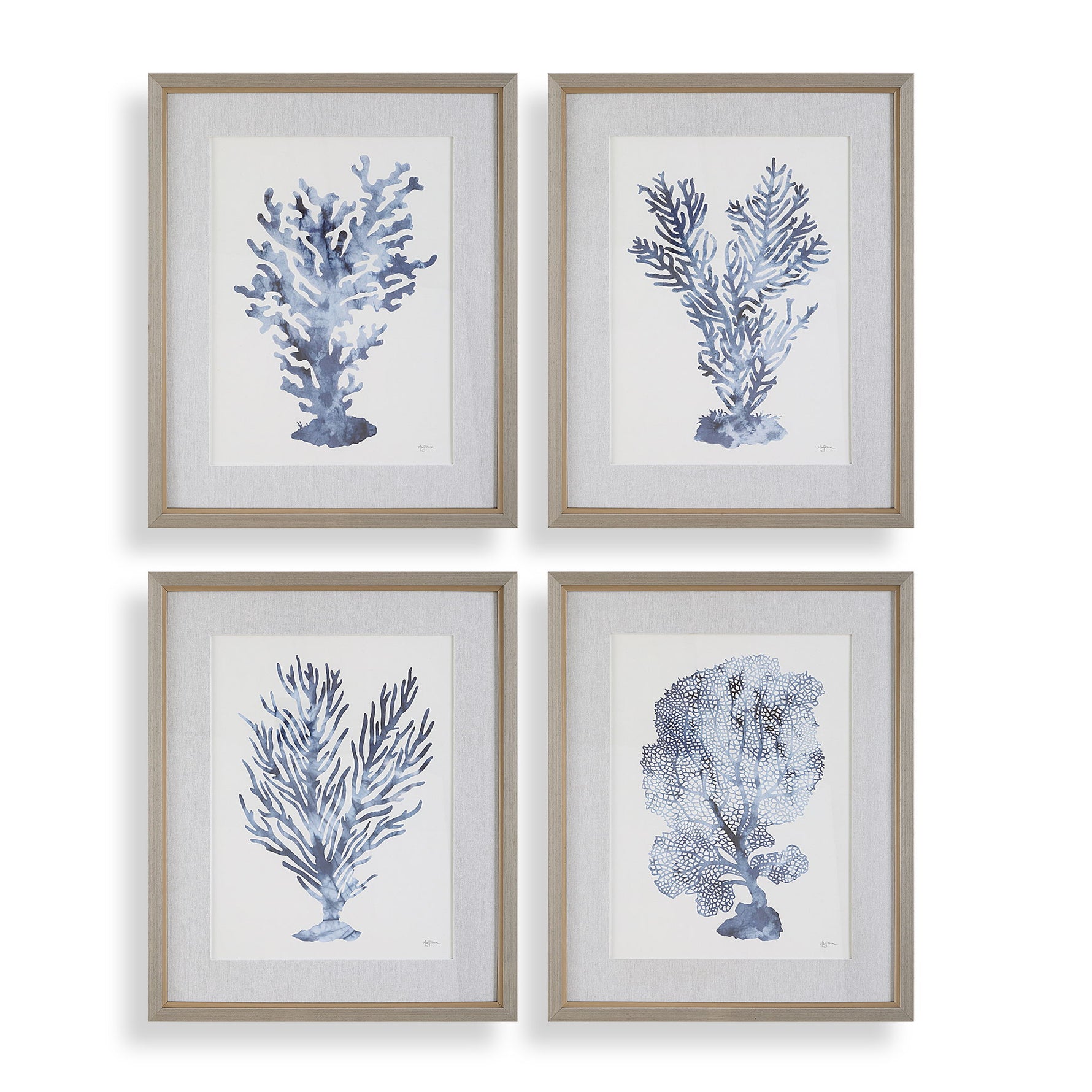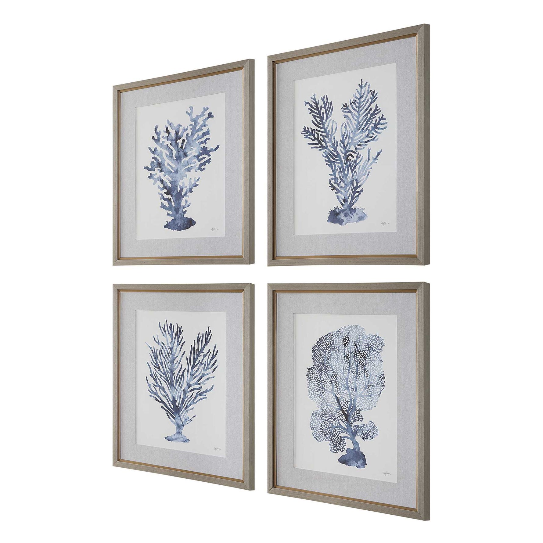 This Set Of Four Prints Showcases The Intricate Beauty Of Coral Formations, Brought To Life In A Soothing Blue Monochromatic Palette. Each Of The Prints Are Accented By An Oatmeal Linen Wrapped Mat And A Light Gray Wood Toned Frame With A Petite Champagne Liner. Each Print Is Placed Under A Protective Glass. Artwork By Mary Urban.