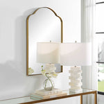 The Sidney Arch Showcases A Gracefully Curved Silhouette With A Plated Brushed Brass Finish Over A Stainless Steel Frame, Surrounding A Floating Polished Edge Mirror.