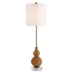 Where Elegance Meets Modern Sophistication, The Sienna Buffet Lamp Features A Caramel Brown, Seeded Glass Base. The Design Is Elevated With A Thick Crystal Foot And Accents Of Plated Brushed Antique Brass Hardware, Adding A Touch Of Refined Luxury To Any Setting. The Round Drum Hardback Shade Is Covered In A White Linen Fabric.