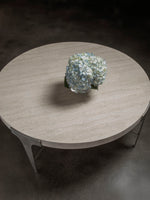 Unit price perLaser-cut steel base in a ribbed silver leaf finish with a White Vein inset travertine top resting on saber shaped legs with decorative stretcher.
