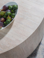 - Drum-style Cocktail Table In Veneered White Vein Travertine On A Recessed Plinth Base In A Silver Finish. White Travertine Is A Product Of Nature And Will Vary In Coloration From Piece To Piece.