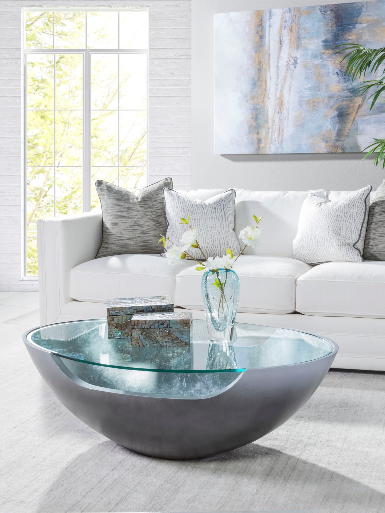 - Oval Bowl-effect Table With Smooth A Exterior In An Silver Gray With Ombré Effect, Contrasted Against An Interior In Silver Leaf, With Inset Tempered Glass Top