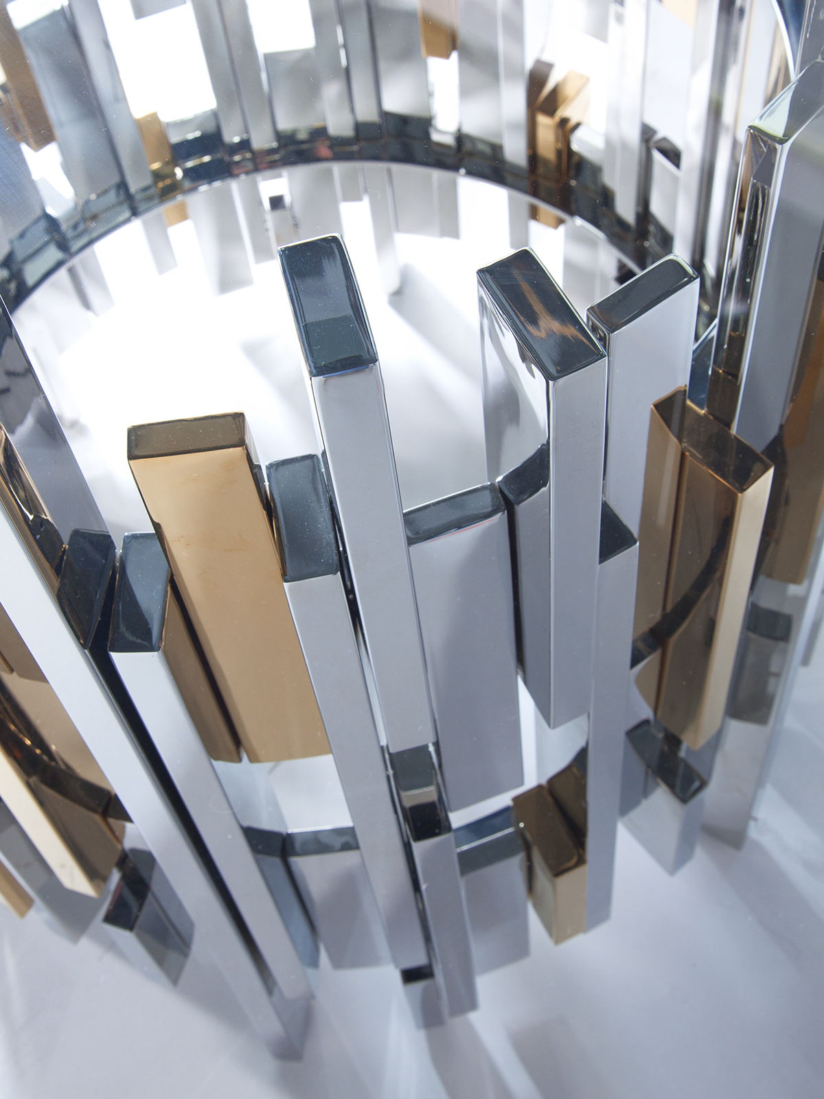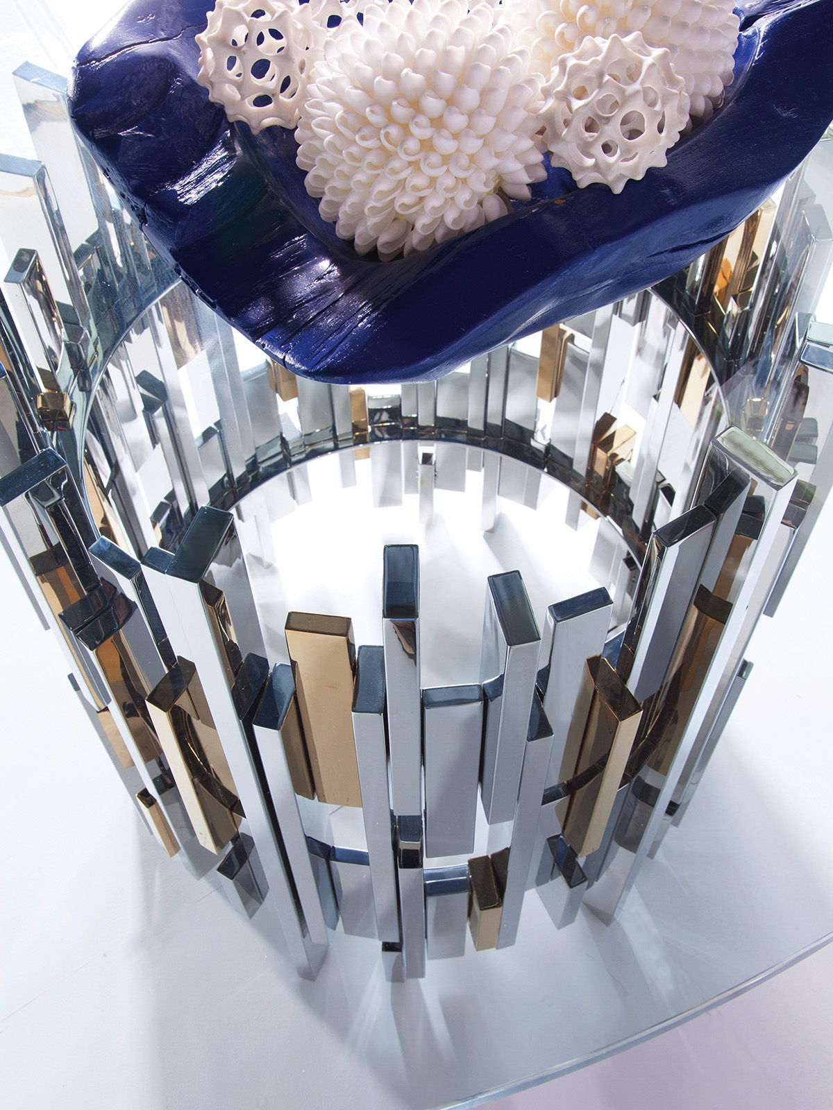 Contemporary asymmetrical designs crafted from stainless steel with certain elements electroformed with brass in a vintage coloration paired with a 60-inch glass top