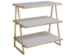 The sleek, light beauty of the design features three tiered capiz shell sheves glistening beneath the lay on glass top, and complimenting the foil finished iron base.