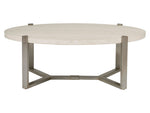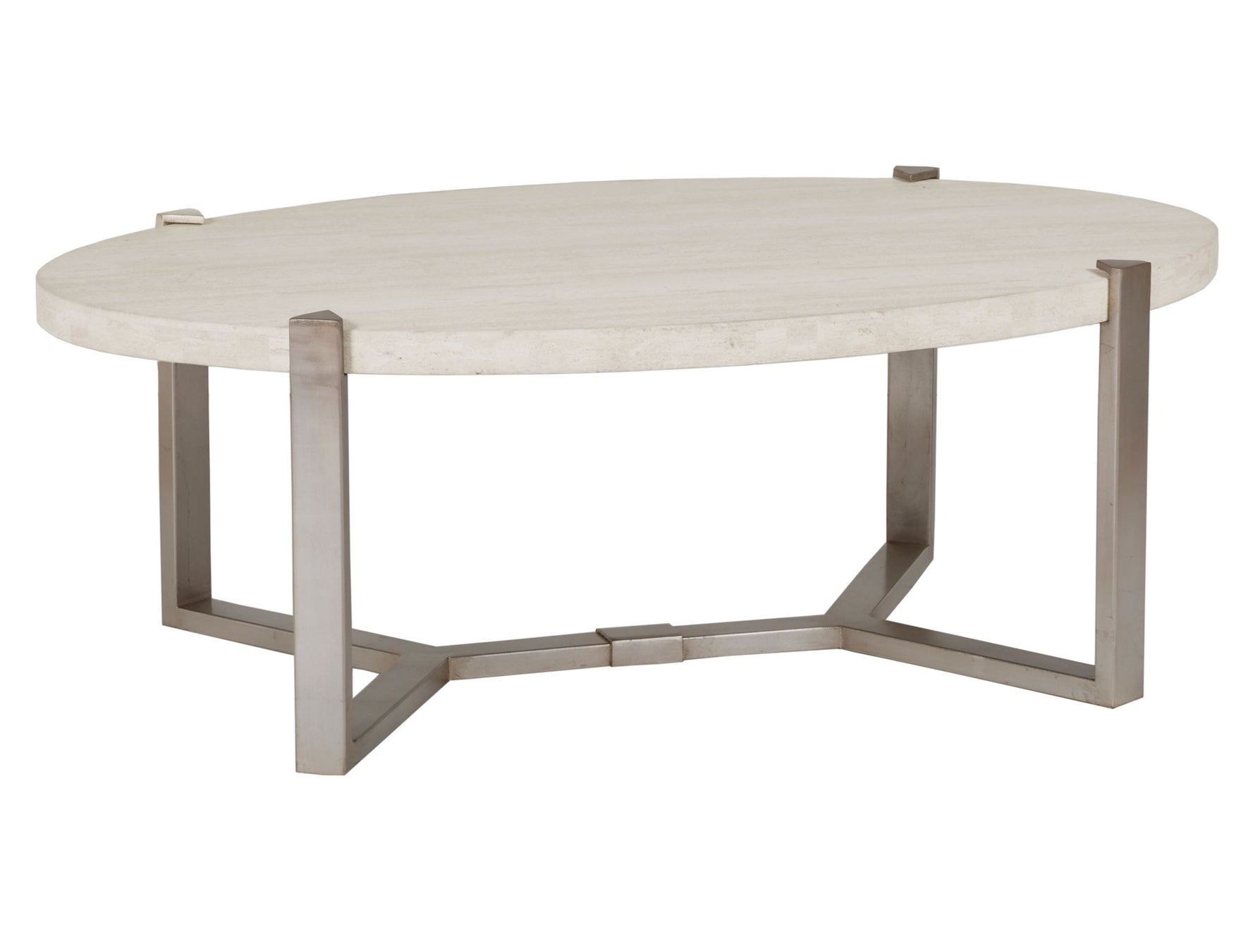 - Versatile Contemporary Cocktail Table Featuring A Honed White Vein Travertine Top Standing On An Iron Base In A Champagne Silver Leaf Finish