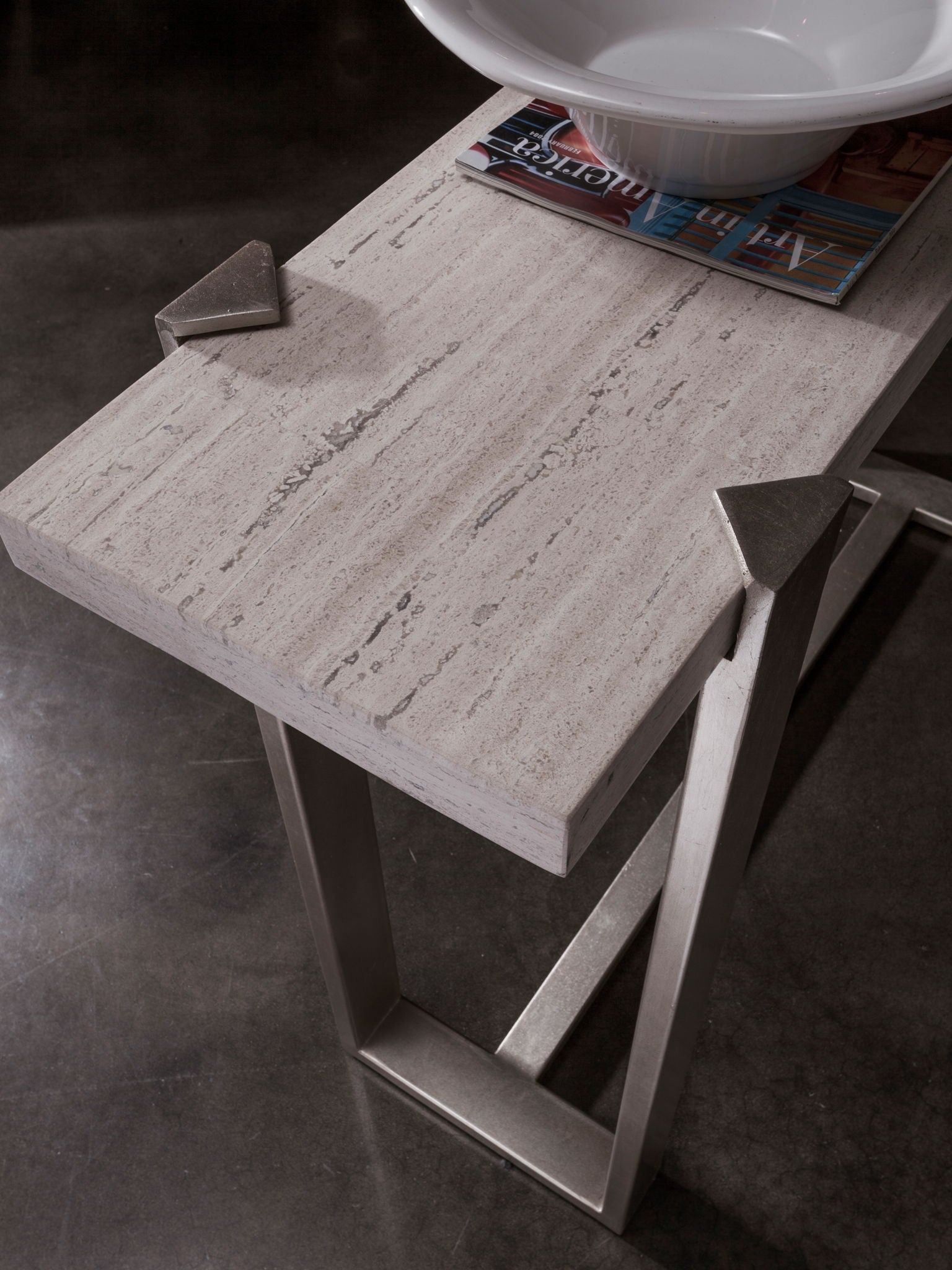 - Iron Base In Champagne Silver Leaf, Veneered White Travertine.