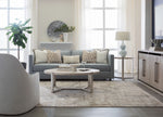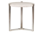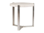 • Versatile Contemporary Occasional Table Featuring A Honed White Vein Travertine Top Standing On An Iron Base In A Champagne Silver Leaf Finish