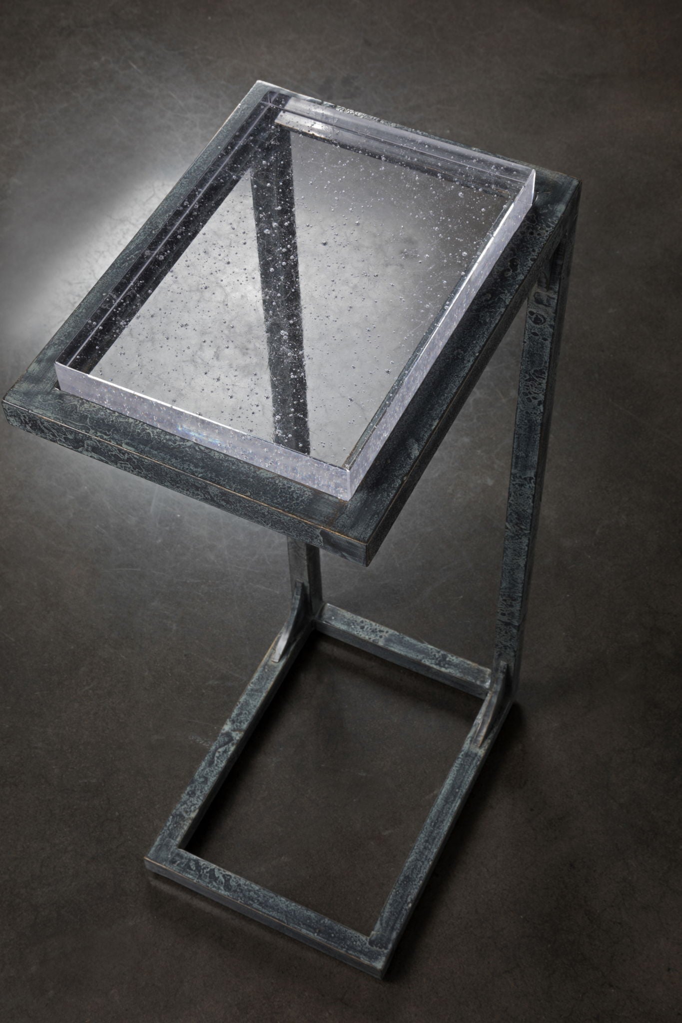 • Hand-forged Contemporary C-style Table In A Rich Natural Iron Finish And Completed With A Thick Insert Of Clear Bubble Art Glass. Each Clear Bubble Art Glass Top Is Individually Cast And Will Vary In Appearance And Coloration From Piece To Piece.
