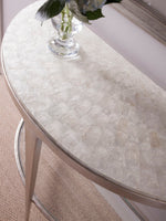 - Capiz Shell Inlay Top On Hand-forged Iron Base In A Champagne Foil Finish With A Tempered Glass Shelf Below.
