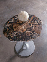• Hand-forged Iron Base In Antiqued Iron Finish, Veneered Petrified Wood Top.