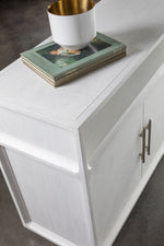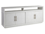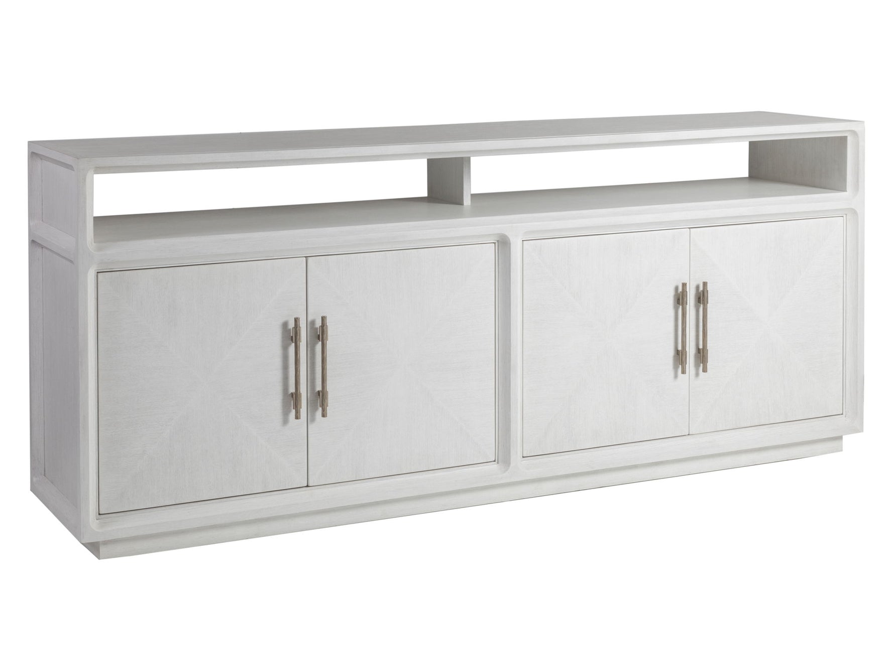 • Contemporary Desings Crafted From Mahogany Solids And Quartered Mahogany Veneers, Finished In Inverno, A Wire-brushed Arctic White Finish With A Touch Of Gray In The Grain. Four Doors, Four Adjustable Shelves And Custom Hardware In An Antique Champagne Finish. The Console Is Ventilated With A Removable Back Panel For Electronics.