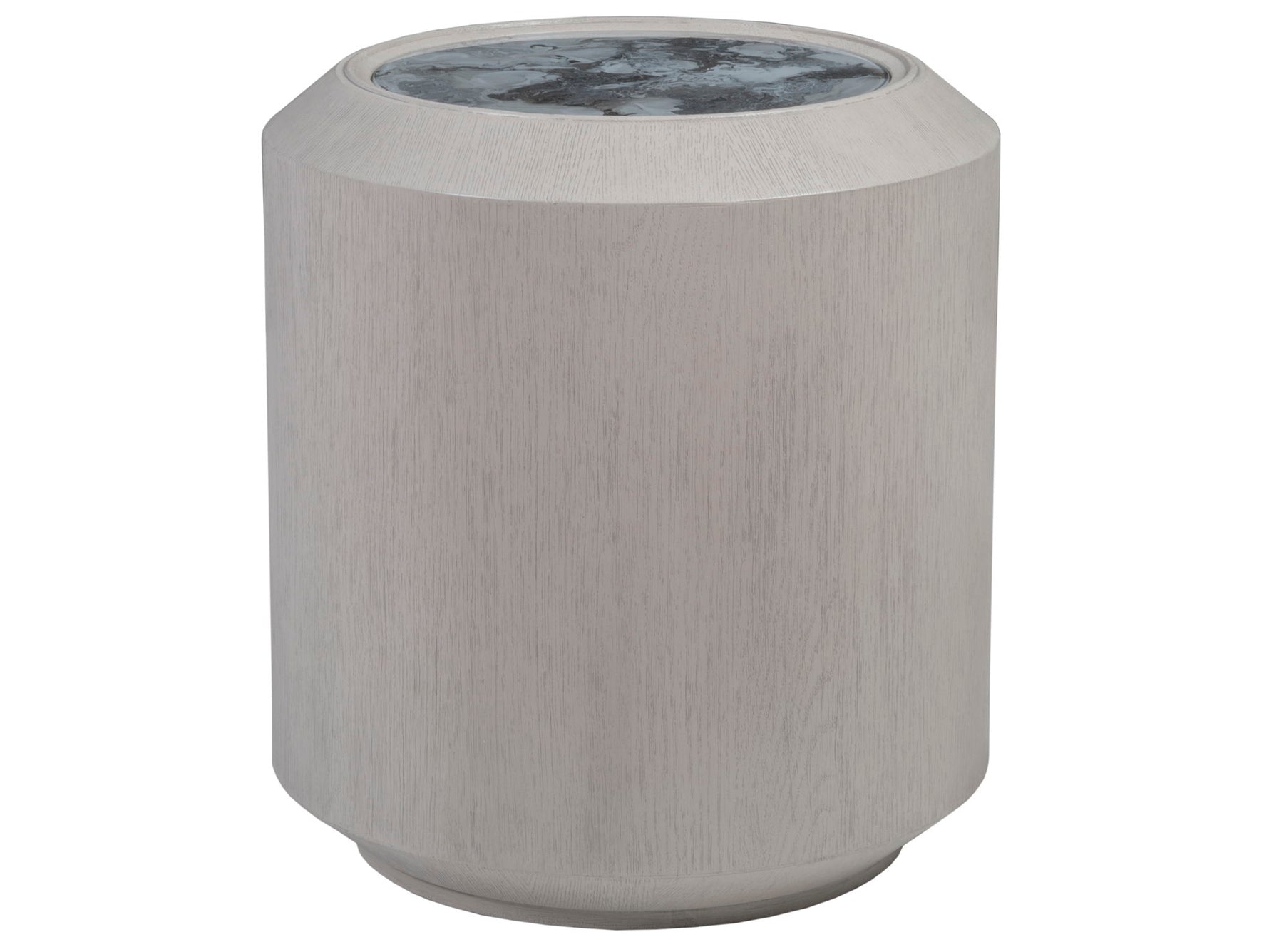 • Contemporary Designed Chamfered Drum Table With Inset Eglomise Top, Crafted From White Oak Solids And Select Hardwoods In A White Sandblasted Finish.
