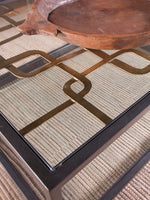 Unit price perAntique black finished metal base with decorative hand-forged fretwork top in a glazed gold foil finish with a tempered glass insert and glass shelf below.