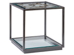 • Antique Black Finished Metal Base With Decorative Hand-forged Fretwork Top In A Glazed Gold Foil Finish With A Tempered Glass Insert And Glass Shelf Below.