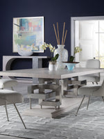 - Modern Design Crafted From Quartered Oak Veneers In Cerused Misty White Gray Finish And Sculptural Brushed Stainless Steel Pedestals Sitting On A Stepped Wooden Base