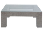 - Veneered Raffia Base With Mitered Corners In A Light Gray Coloration And A Tempered Glass Top With Flat Polished Edge.