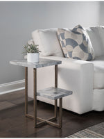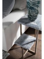 • Gray Mist Stone Top And Shelf, Iron Base In Antiqued Silver Finish.
