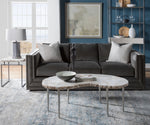 - Contemporary Design With Six Round Tapered Iron Legs In A Silver Finish With A Hint Of Gold.