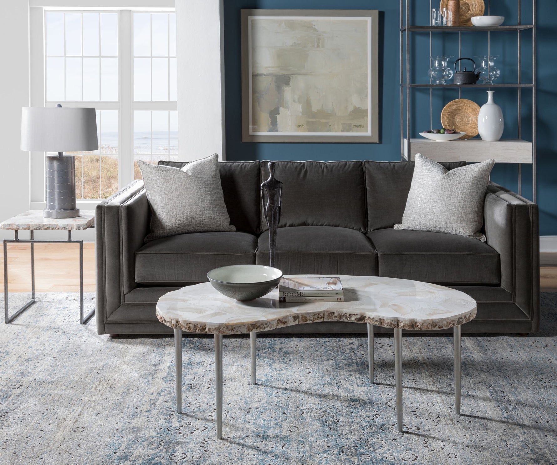 - Asymmetrical, Shapely Live-edge Cocktail Inlaid With Fossilized Shell Standing On Tapered Iron Legs In A Silver Finish With A Hint Of Gold
