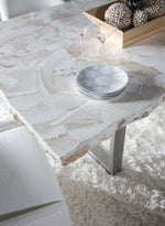 - Contemporary Live-edge Dining Table Featuring A Slab Top Two Inches Thick, Inlaid With Fossilized White Clam Shell And Standing On Simple Iron Sled Bases In A Silver Finish With A Hint Of Gold