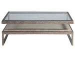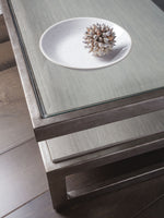 Unit price perContemporary design crafted from antiqued silver leaf finished metal base, inset tempered glass top, with inset quartered white oak shelf in a wire brushed light gray finish.