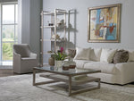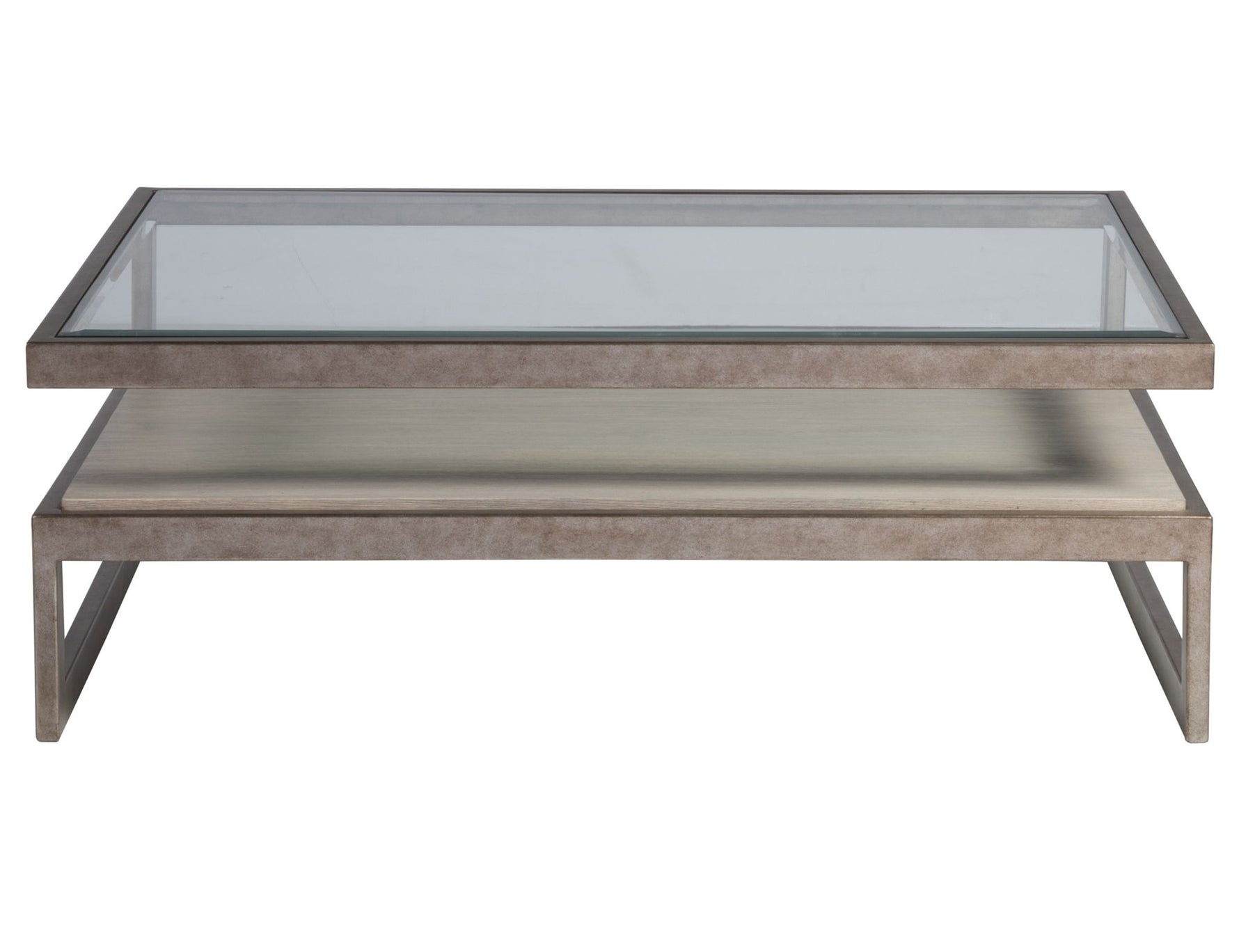 - Contemporary Design Crafted From Antiqued Silver Leaf Finished Metal Base, Inset Tempered Glass Top, With Inset Quartered White Oak Shelf In A Wire Brushed Light Gray Finish.