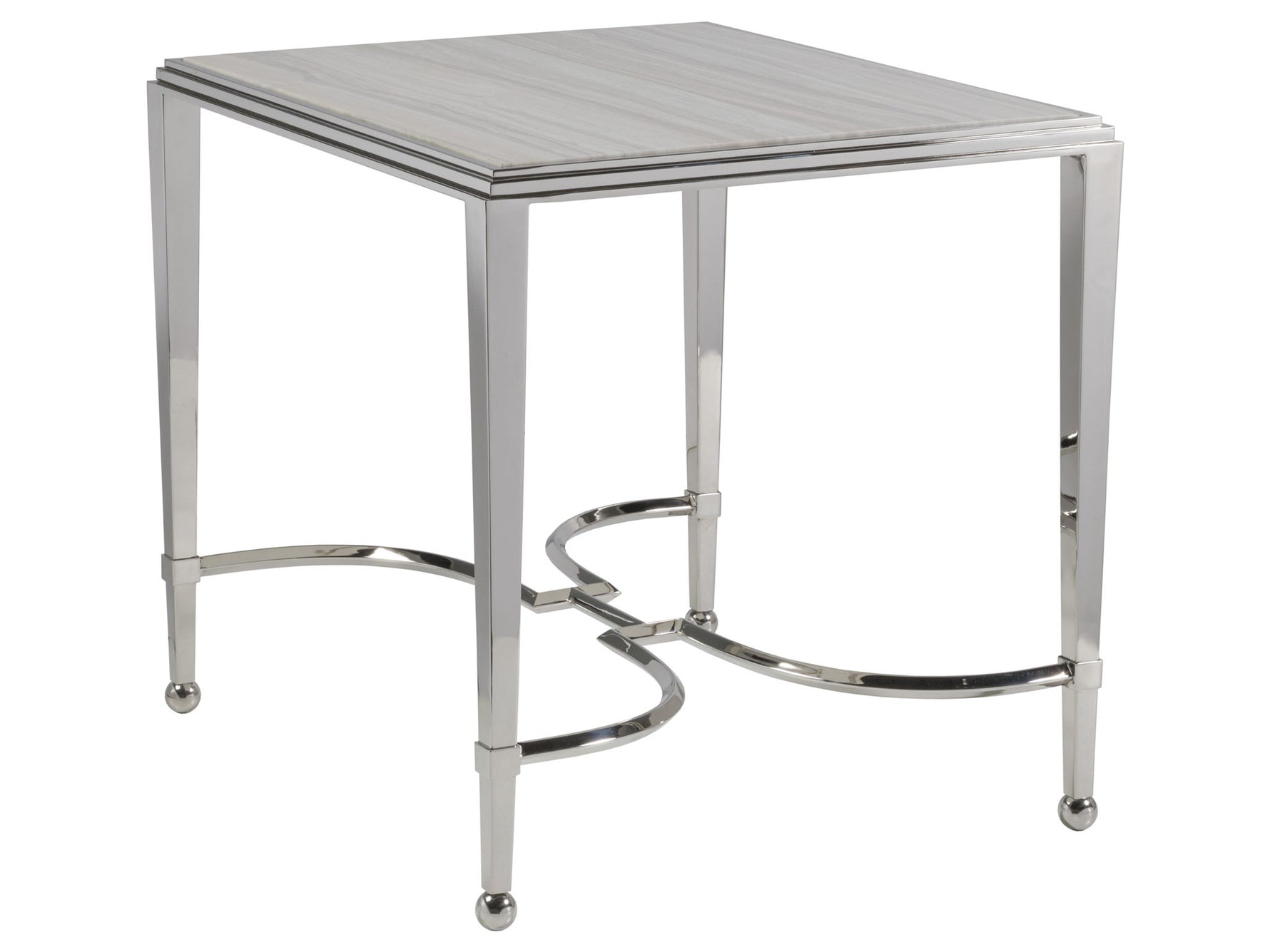 - Polished Stainless Steel, Inset Silver White Travertine Top, Tapered Leg .