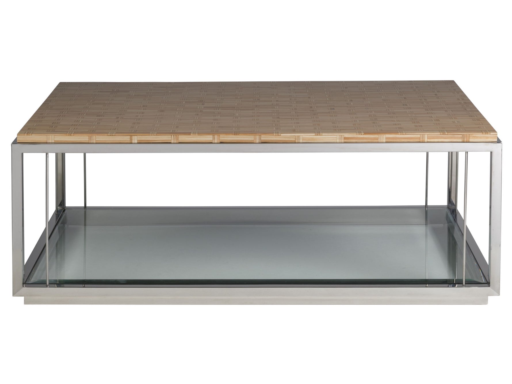 - Polished Stainless Steel Base, Top In Sliced Rattan Marquetry Veneer In Basketweave Pattern, Inset Tempered Glass Shelf With 1 Bevel